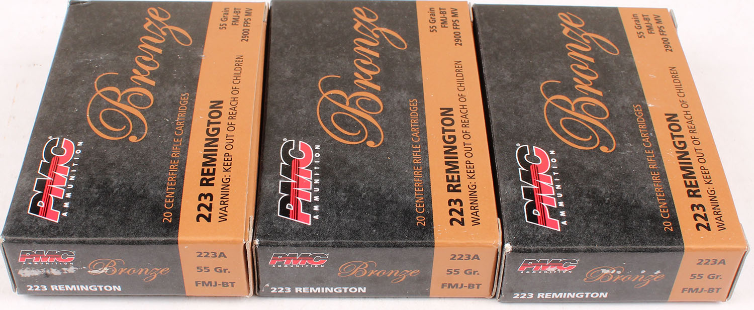 Lot of 3 PMC, Bronze, .223 Remington, 55 Grain FMJ-BT, Full, 1pc., multi-colored box, box is solid with excellent color, Ammo is excellent. Grade: Excellent - Value: 16 to 50