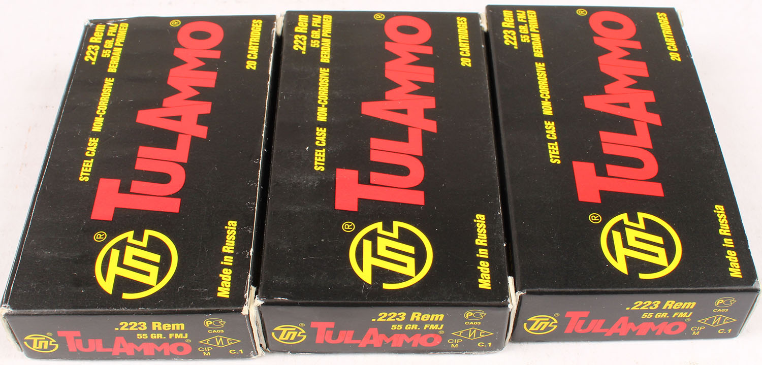 Lot of 3 Tul-ammo, .223 Rem, 55 Grain, Full, 1pc., multi-colored box, box is solid with excellent color, Ammo is excellent. Grade: Excellent - Value: 10 to 50