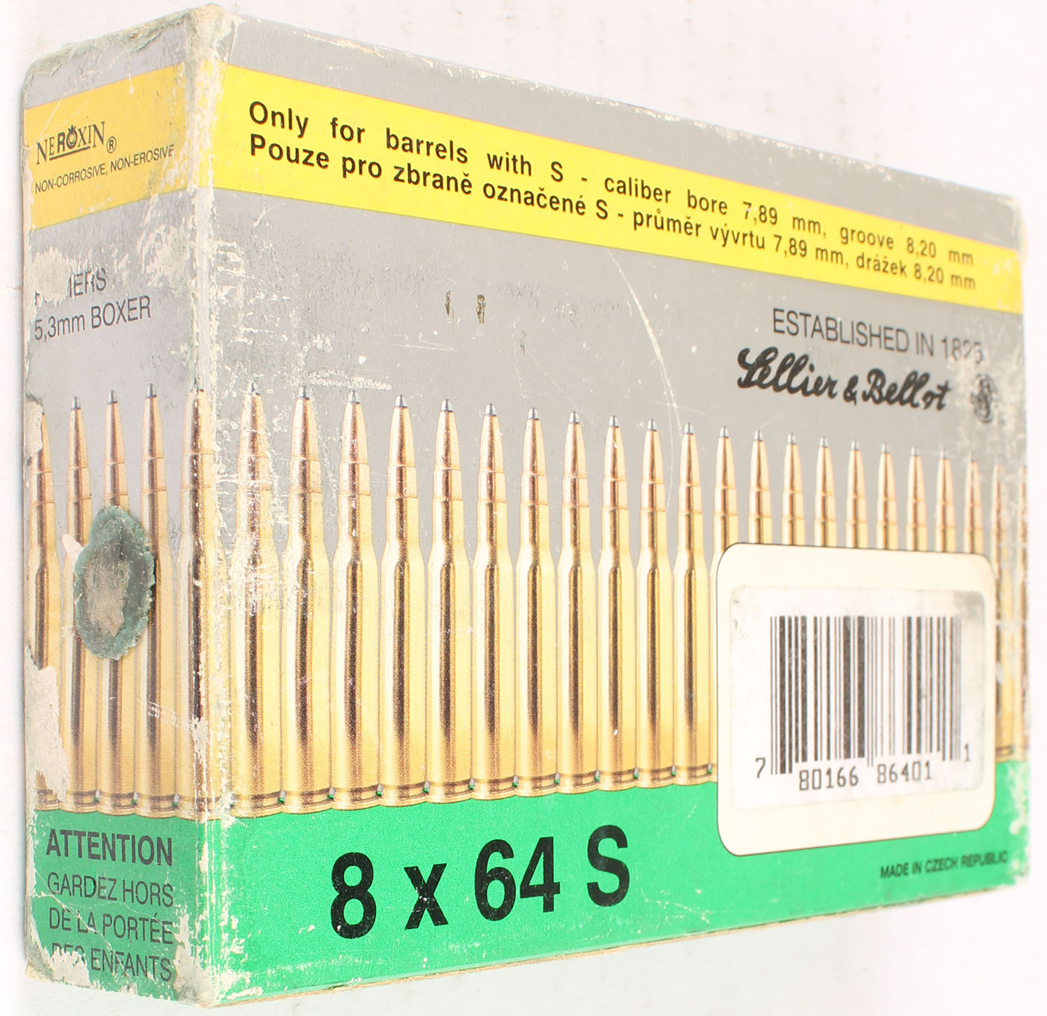 Sellier & Bellot, 8 x 64 S, FULL, has scuffing, ammo is very good. Grade: Very Good ++ - Value: 10 to 50