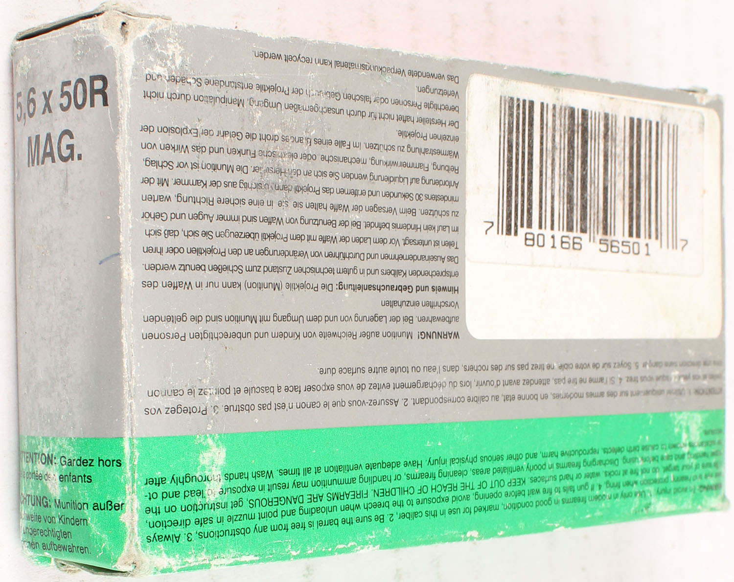Sellier & Bellot, 5.6 x 50 R MAG., FULL, has scuffing, ammo is very good. Grade: Very Good ++ - Value: 10 to 50
