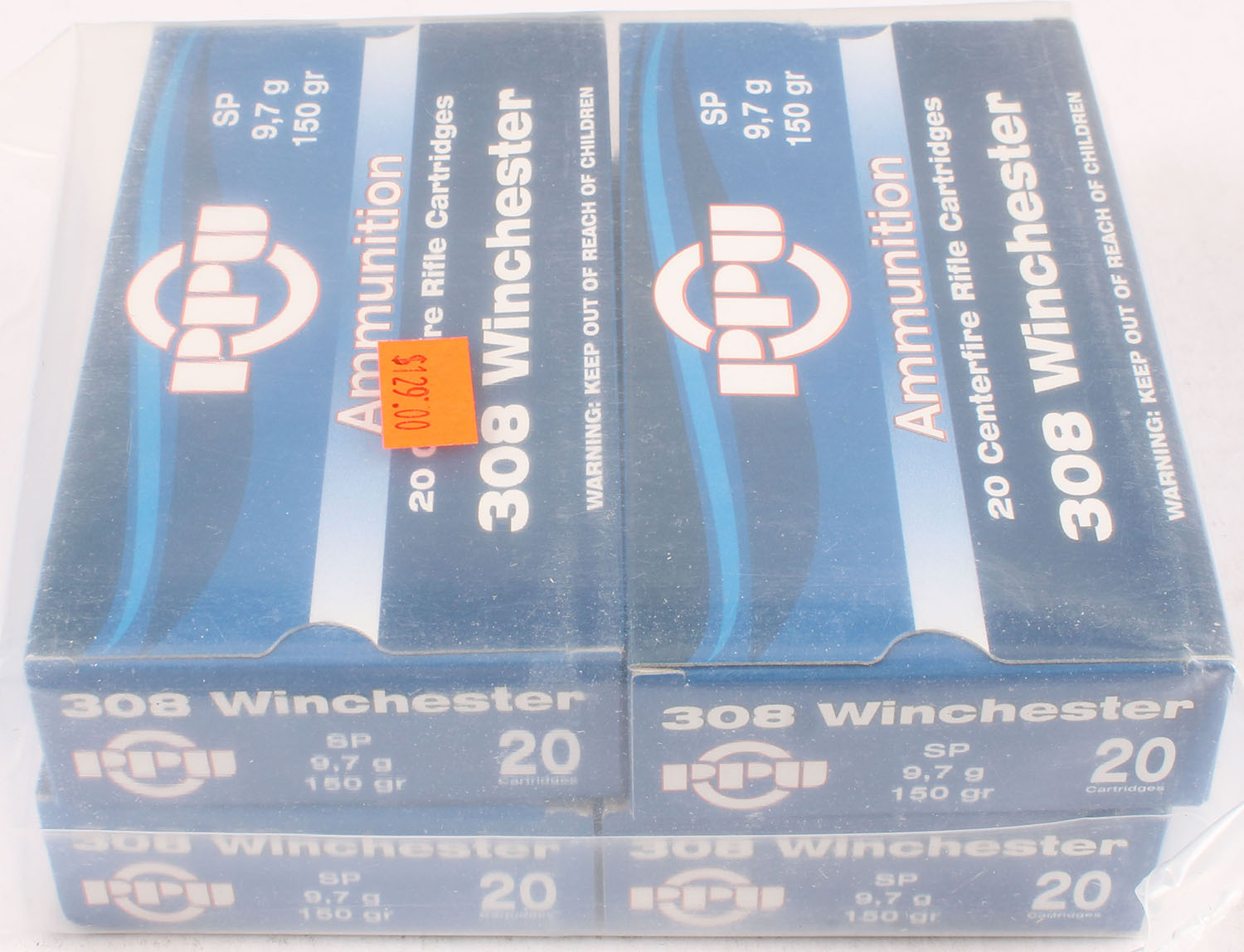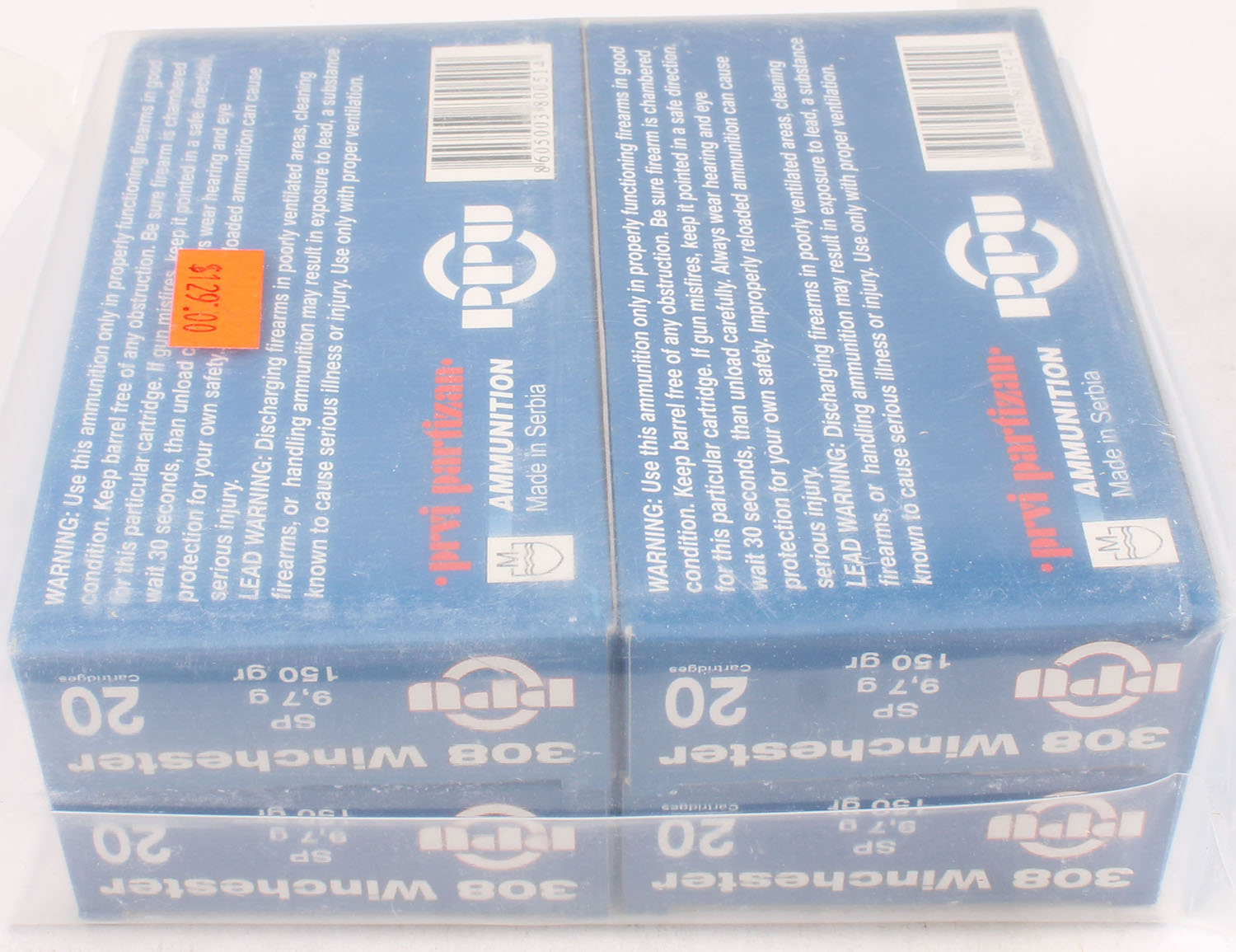Lot of 4 PPU, .308 Win., 150 Grs., Full, 1pc. Multi-colored box, box is solid, with excellent color, Ammo is excellent. Grade: Excellent - Value: 50 to 150