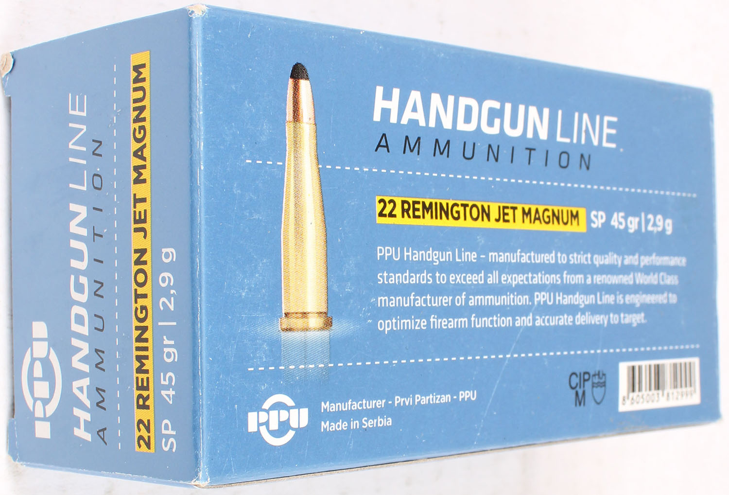 PPU, 22 Remington Jet magnum, 45 Grs., Full, 1pc. Multi-colored box, box is solid, with excellent color, Ammo is excellent. Grade: Excellent - Value: 10 to 50