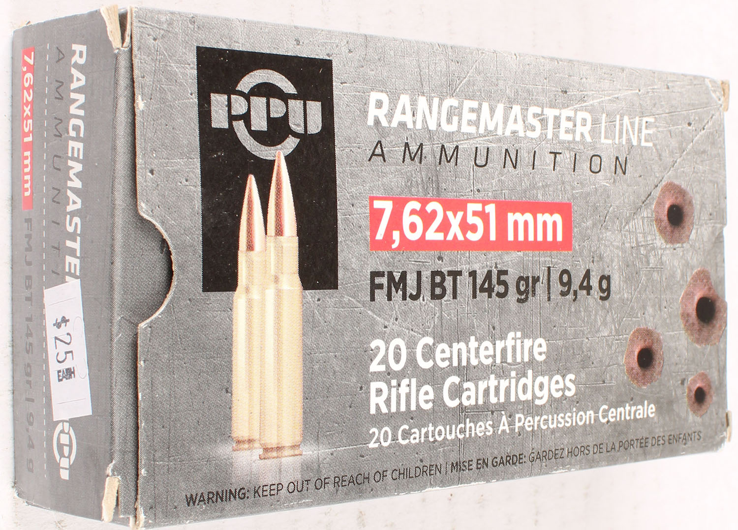 PPU, 7.62 x 51 mm, 145 Grs., Full, 1pc. Multi-colored box, box is solid, with excellent color, Ammo is excellent. Grade: Excellent - Value: 16 to 60