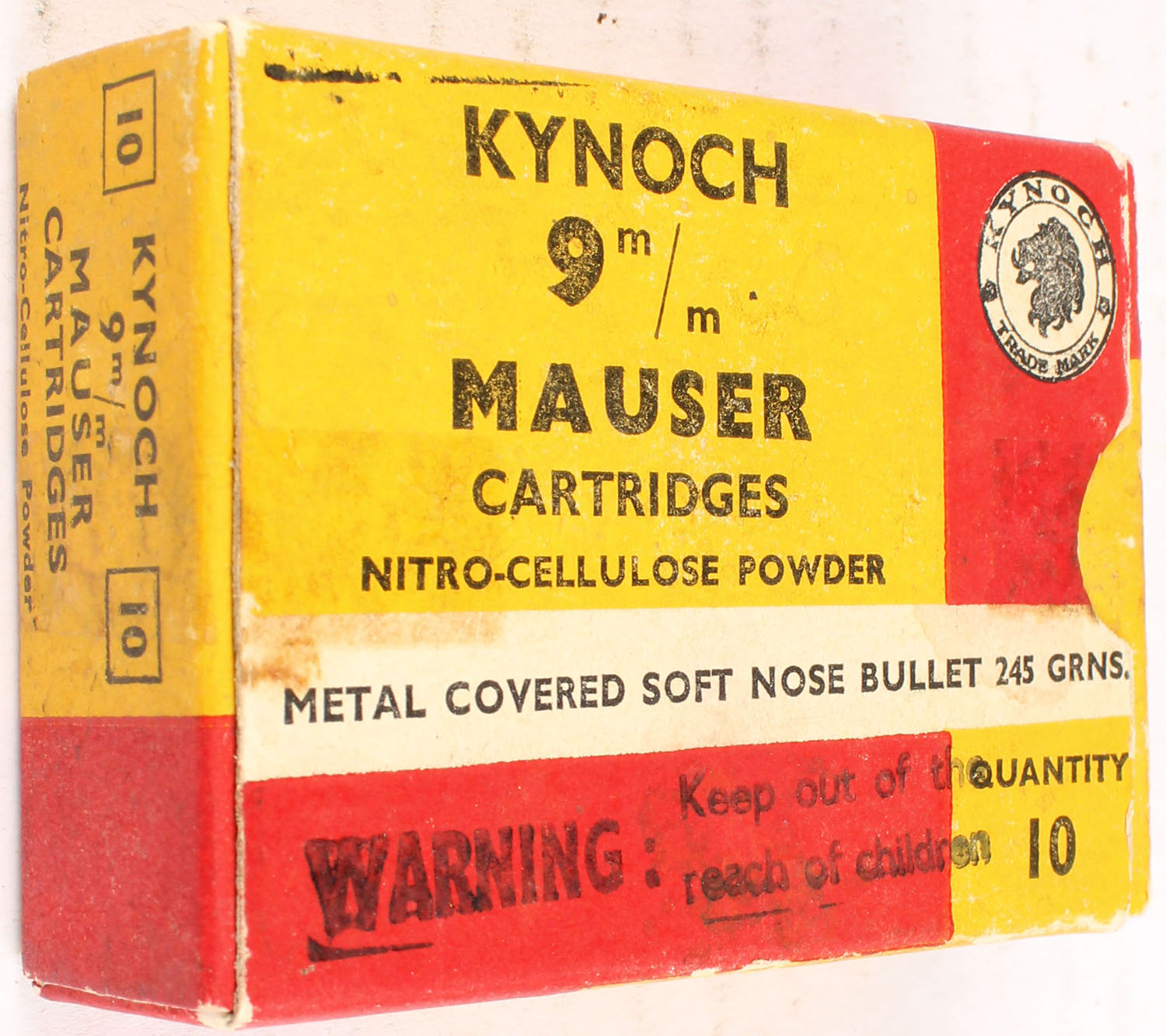 Kynoch, 9 m/m, 245 Grains, Full, 1pc. Multi-colored box, box has age soiling, Ammo is excellent. Grade: Excellent - Value: 16 to 60