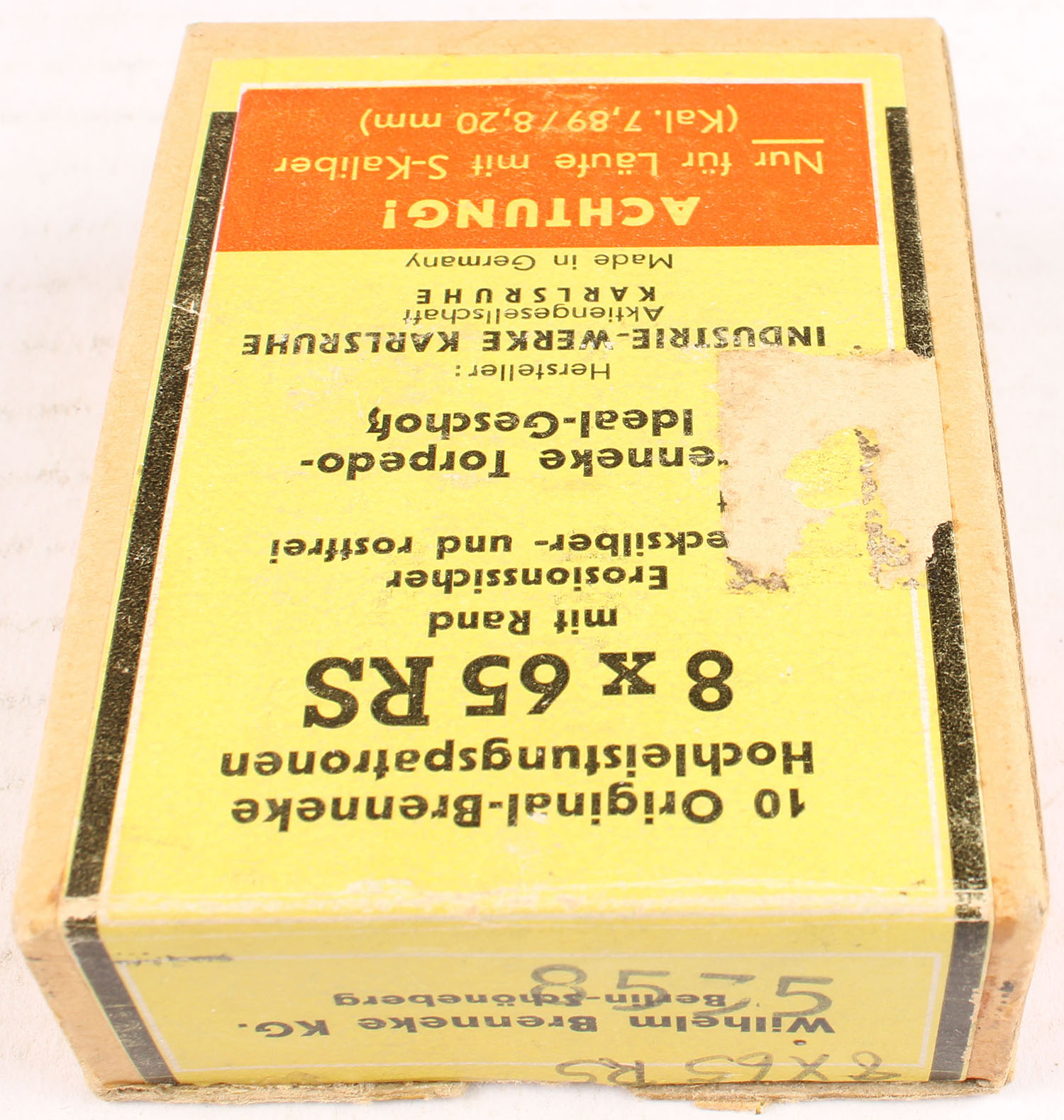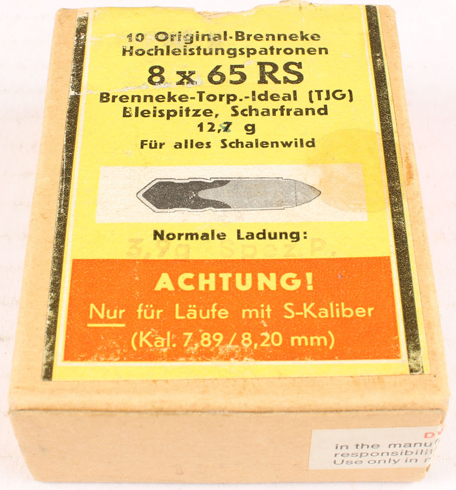 Foreign, Brenneke, 8 x 65 RS, Full, 1pc. Multi-colored box, box has age soiling, Ammo is excellent. Grade: Excellent - Value: 16 to 60