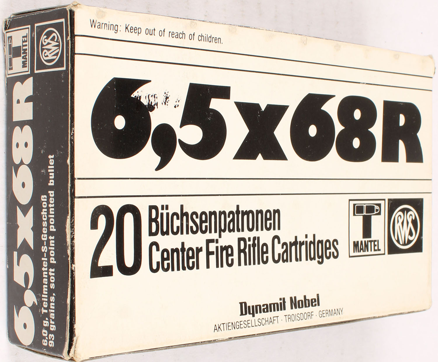 RWS, 6.5 x 68R, Full, 1pc. Multi-colored box, box has age soiling, Ammo is excellent. Grade: Excellent - Value: 16 to 60