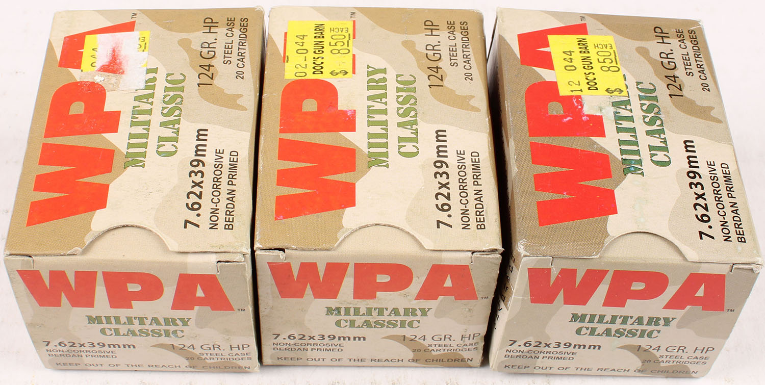 Lot of 3 WPA, 7.62 x 39 mm, 124 Grs. HP, Full, 1pc. Multi-colored box, box is solid, with excellent color, Ammo is excellent. Grade: Excellent - Value: 20 to 80