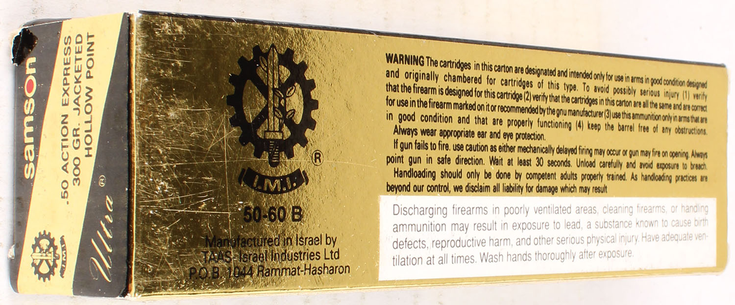 Samson Ultra, .50 AE, 300 Grain JHP, Full, 1pc., Multi-colored box, box is solid with great color, ammo is excellent. Grade: Excellent ++ - Value: 20 to 60