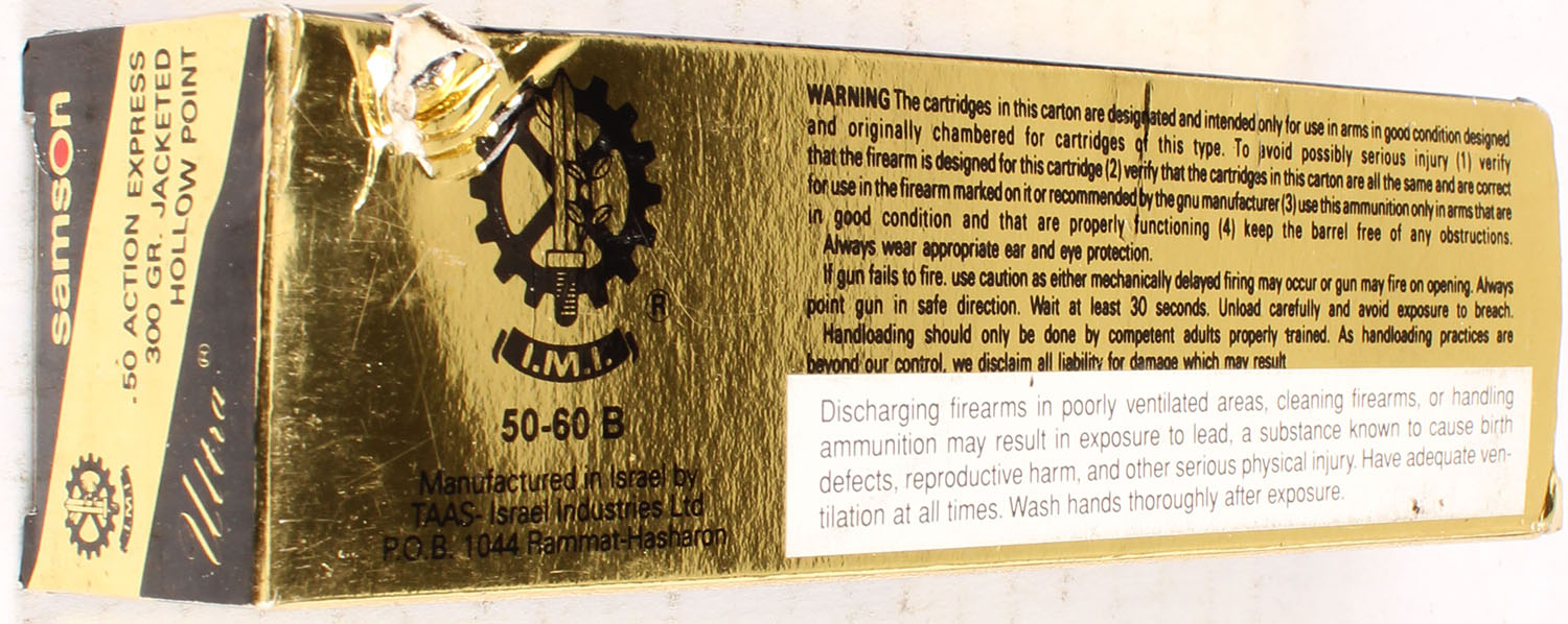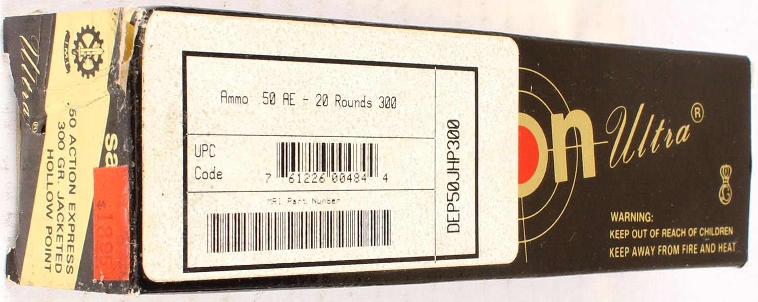Samson Ultra, .50 AE, 300 Grain JHP, Full, 1pc., Multi-colored box, box is solid with great color, ammo is excellent. Grade: Excellent ++ - Value: 20 to 60