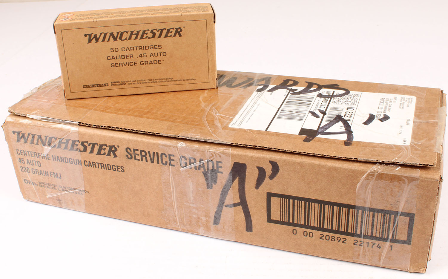 Winchester, Service Grade, .45 Auto, 230 Grain Full Metal Jacket, Partial 9 boxes (450rds.), case, case is solid, inside boxes are minty. Grade: MINT - Value: 150 to 300