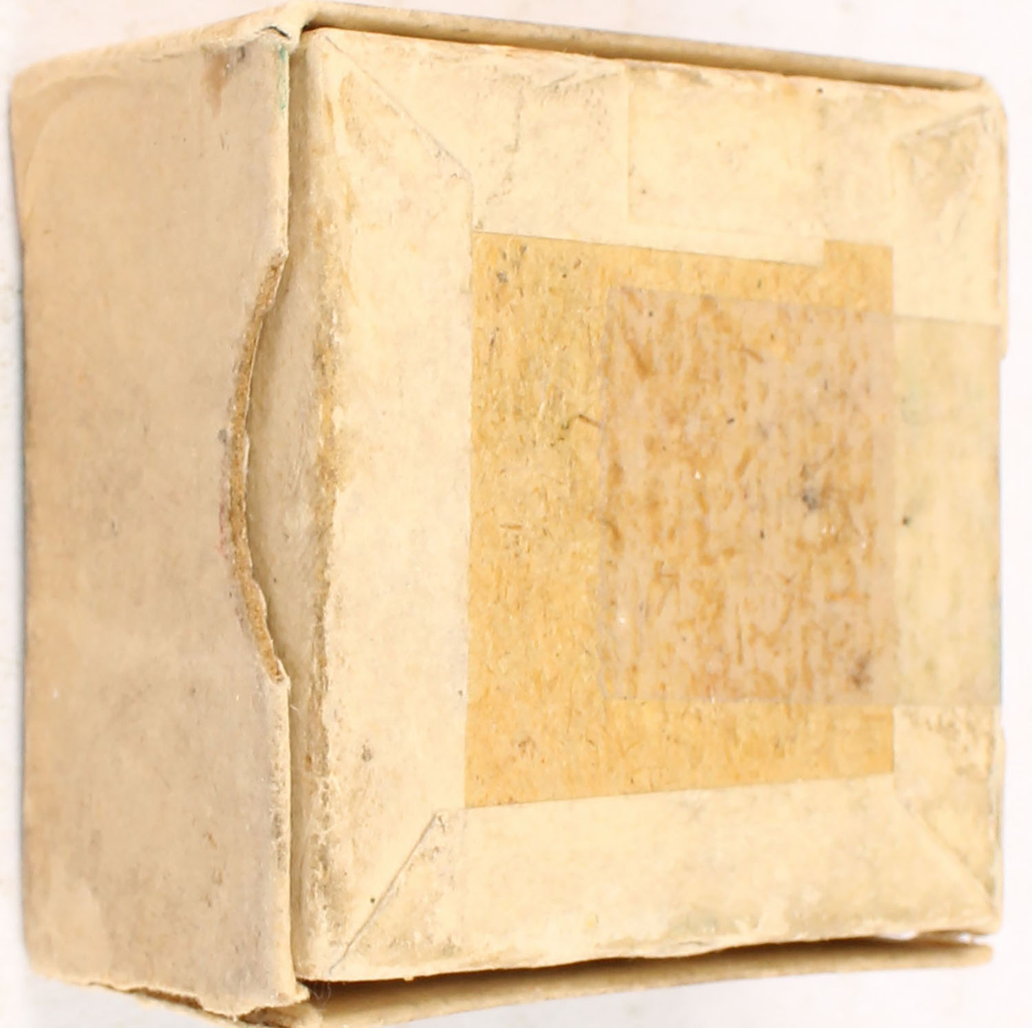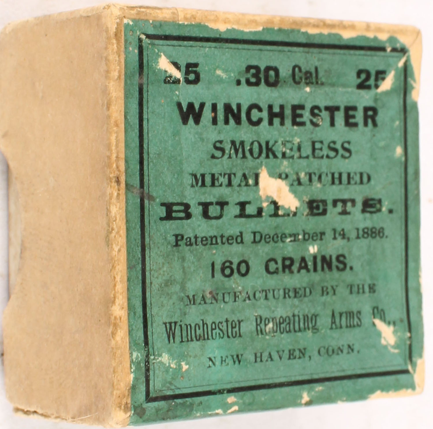 Winchester, .30 Cal., 160 Grain Metal Patched Bullets, Full, 2pc. Buff box with green label, box is solid with very good color, some age soiling, vertical seam splits to both front corners of lid, minor edge & corner wear, label is intact, bullets are excellent. Grade: Very Good ++ - Value: 10 to 40