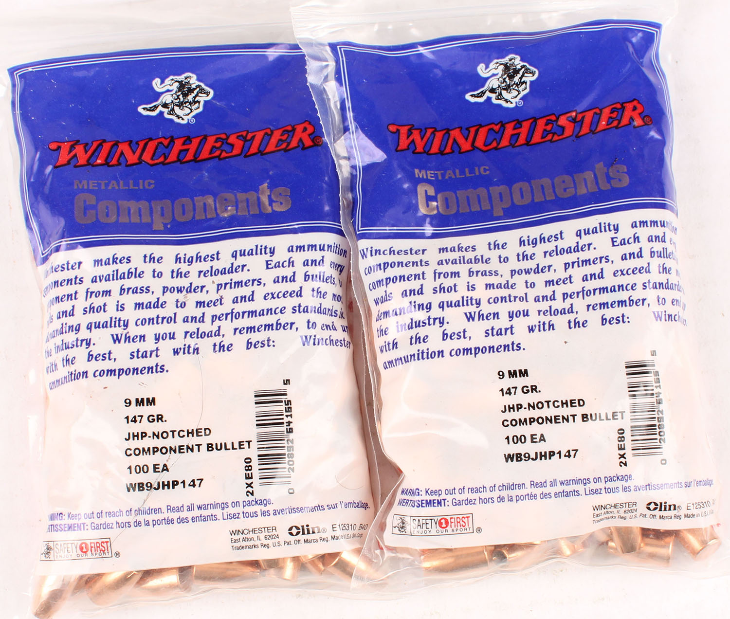 Winchester, Lot of (2) bags of 9mm, 147 Grain Jacketed Hollow Point Notched Component Bullet, both bags of 100rds. are full & sealed. Grade: MINT - Value: 20 to 60
