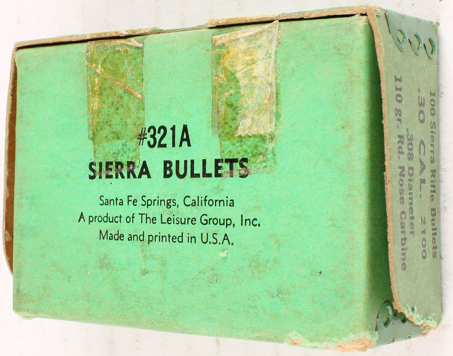 Sierra, .308 Cal., 110 Grain Round Nose Carbine, Full, 1pc. Green & black box, box is soliod with very good to excellent color, minor age soiling & shelf wear, minor corner wear, edges are mostly crisp, top flap is solid, bullets are minty. Grade: Excellent - Value: 10 to 40