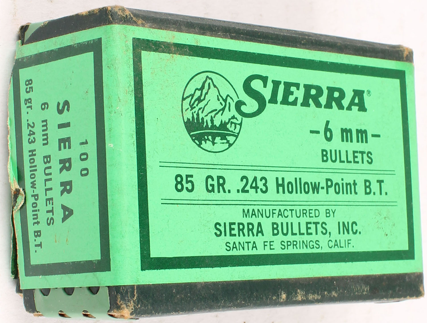 Sierra, 6mm/.243 Cal., 85 Grain Hollow Point Boat Tail, Full, 1pc. Green box with green wraparound label, box is solid with minty color, minor corner wear, edges are mostly crisp, top flap is solid, right end has been written on, bullets are minty. Grade: Excellent + - Value: 10 to 40