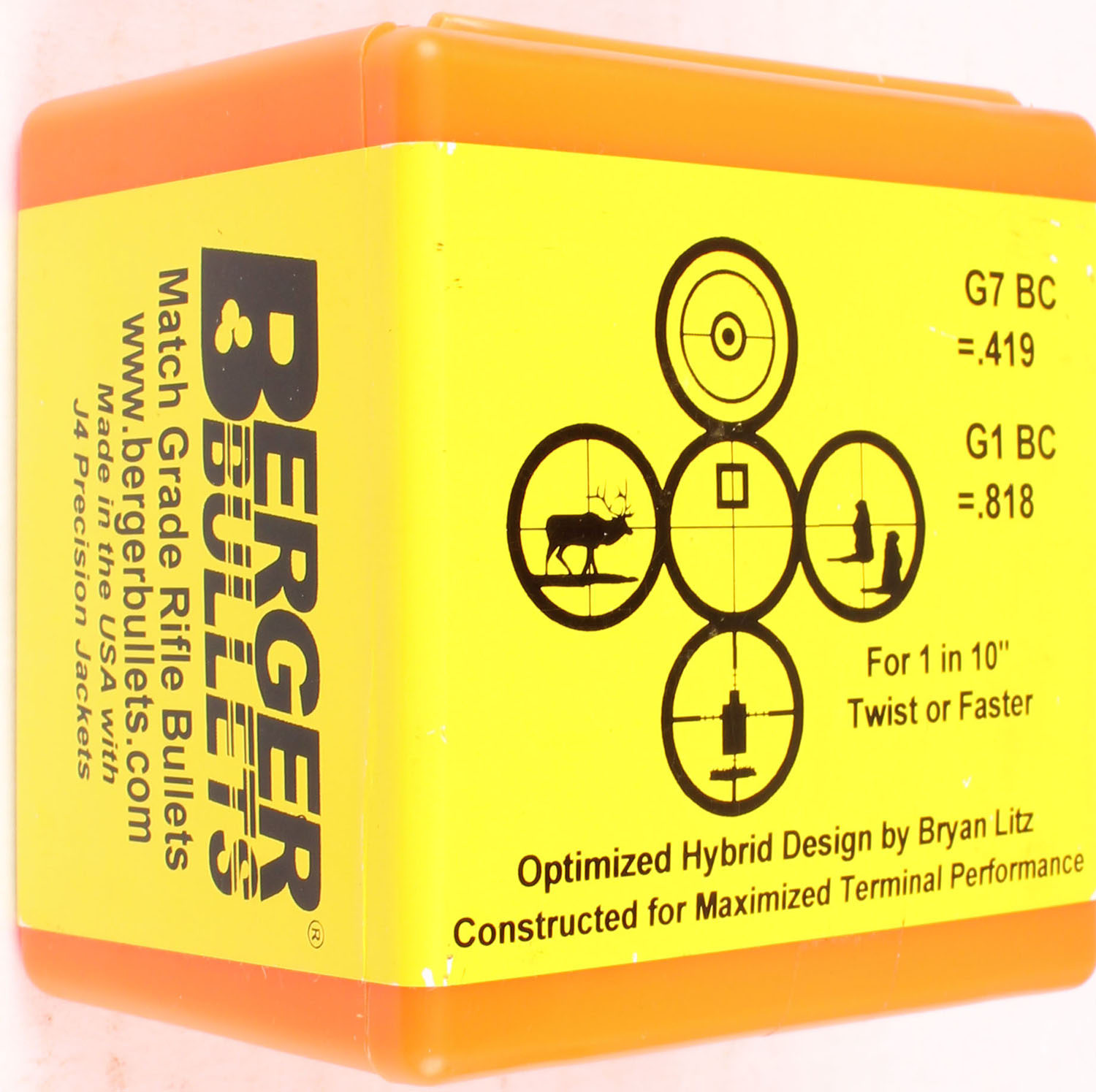 Berger, Elite Hunter, ..38 Cal., 300 Grain Match Grade Rifle Bullets, FULL & SEALED, 1pc. Orange plastic box with yellow wraparound label, box is MINT, label is intact. Grade: MINT - Value: 10 to 50