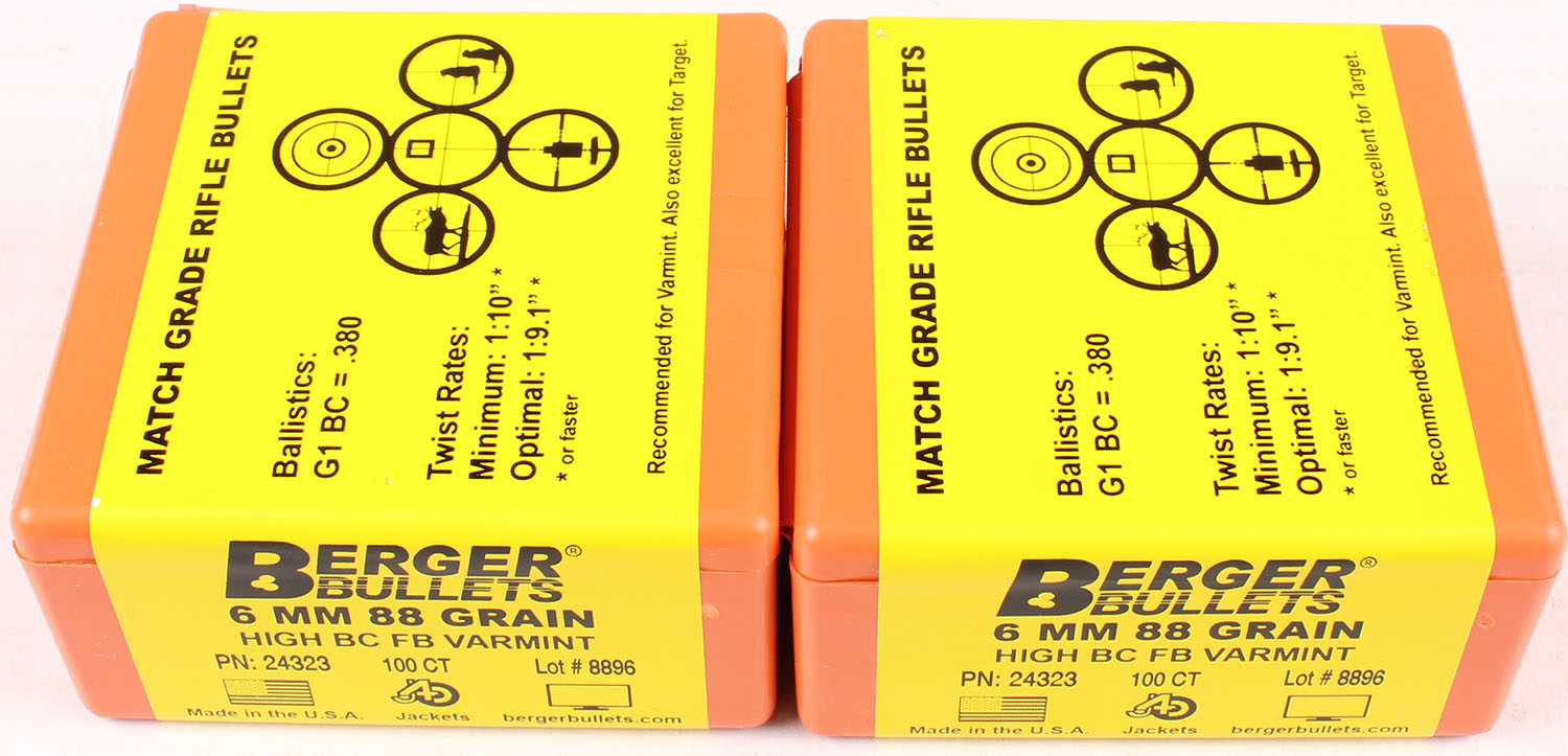 Berger, Lot of (2), 6mm, 88 Grain High BC FB Varmint, Match Grade Rifle Rounds, FULL & SEALED, 1pc. Orange plastic boxes with yellow wraparound labels, both boxes mint, labels are intact. Grade: MINT - Value: 20 to 60