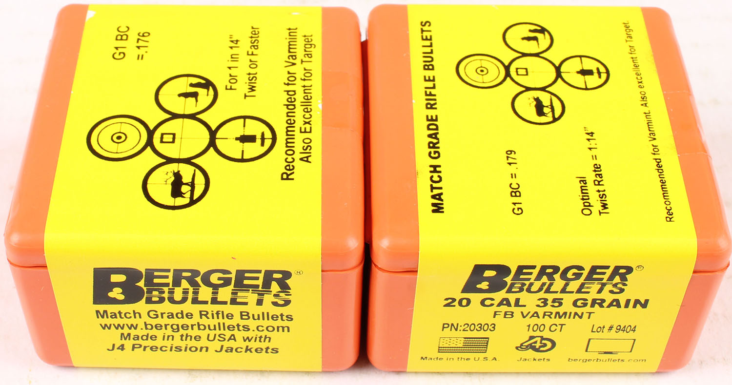 Berger, Lot of (2), .20 Cal., 35 Grain FB Varmint, Match Grade Rifle Rounds, FULL & SEALED, 1pc. Orange plastic boxes with yellow wraparound labels, both boxes mint, labels are intact. Grade: MINT - Value: 20 to 60