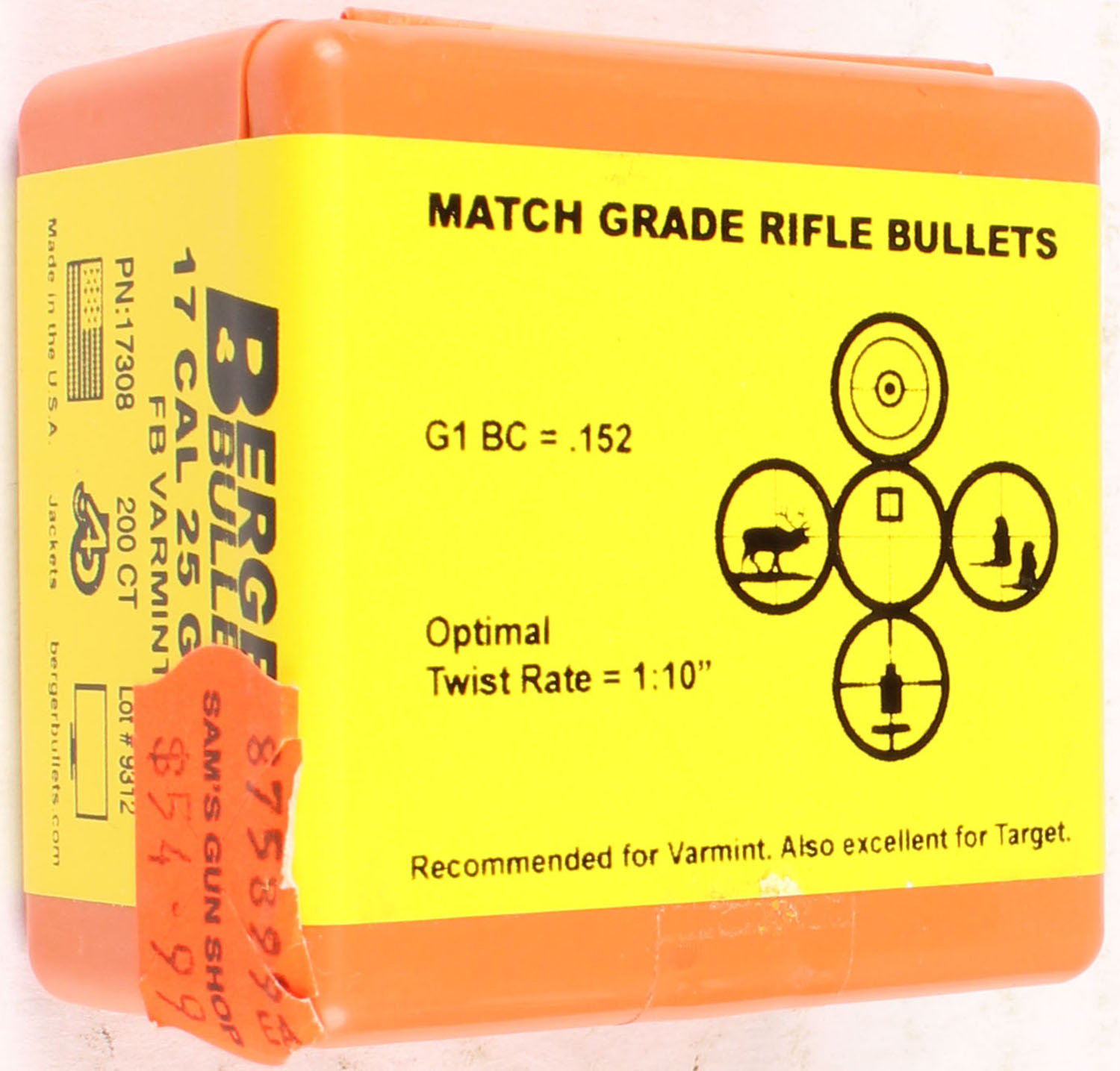 Berger, .17 Cal., 25 Grain FB Varmint, Match Grade Rifle Bullets, FULL & SEALED, 1pc. Orange plastic box with yellow wraparound label, box is MINT, label is intact. Grade: MINT - Value: 10 to 50