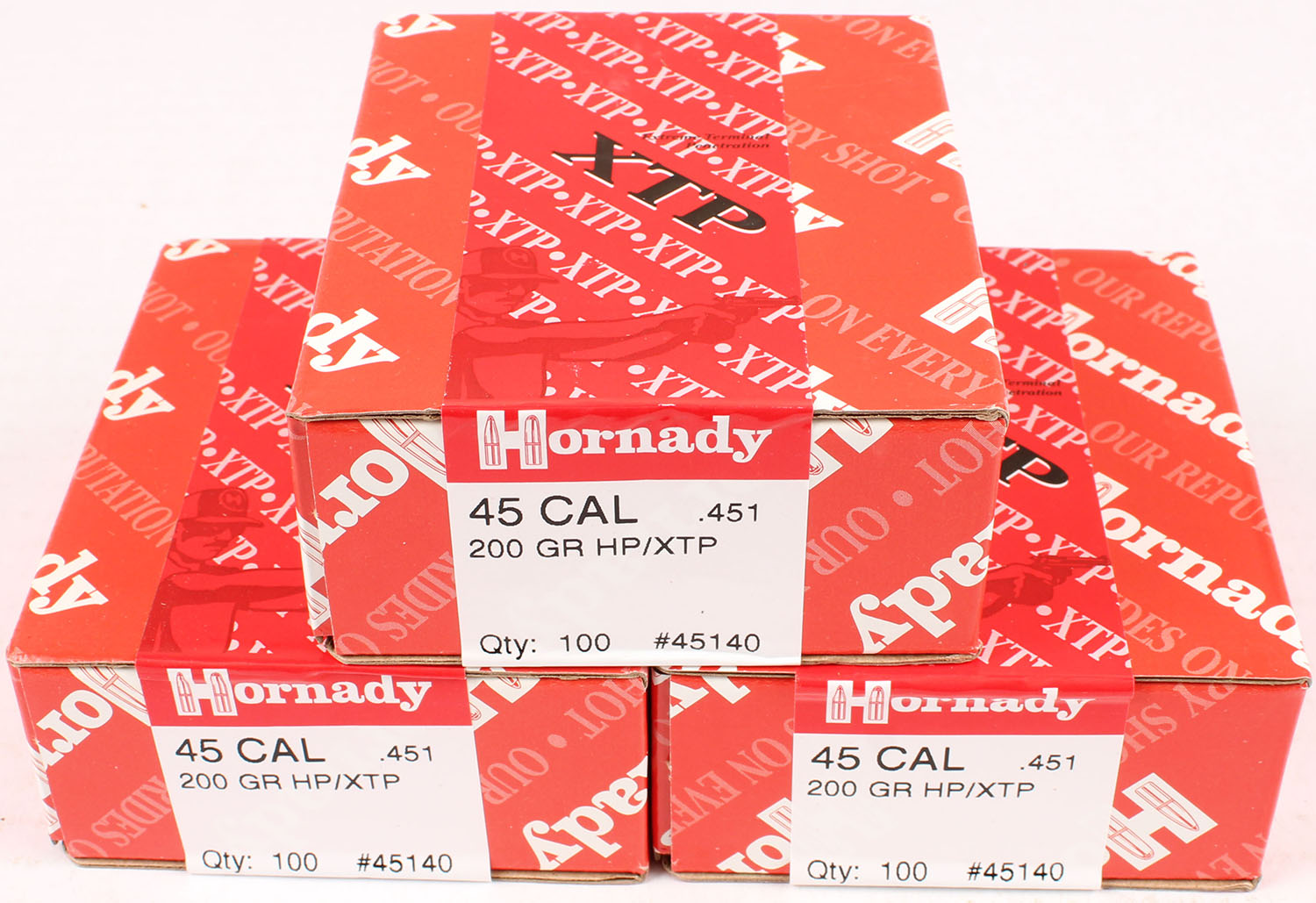 Hornady, Lot of (3), .45 Cal, 200 Grain HP/XTP, .451 Dia., FULL & SEALED, 1pc. Red & white boxes, boxes are MINT with mint colors, labels are intact. Grade: MINT - Value: 30 to 90