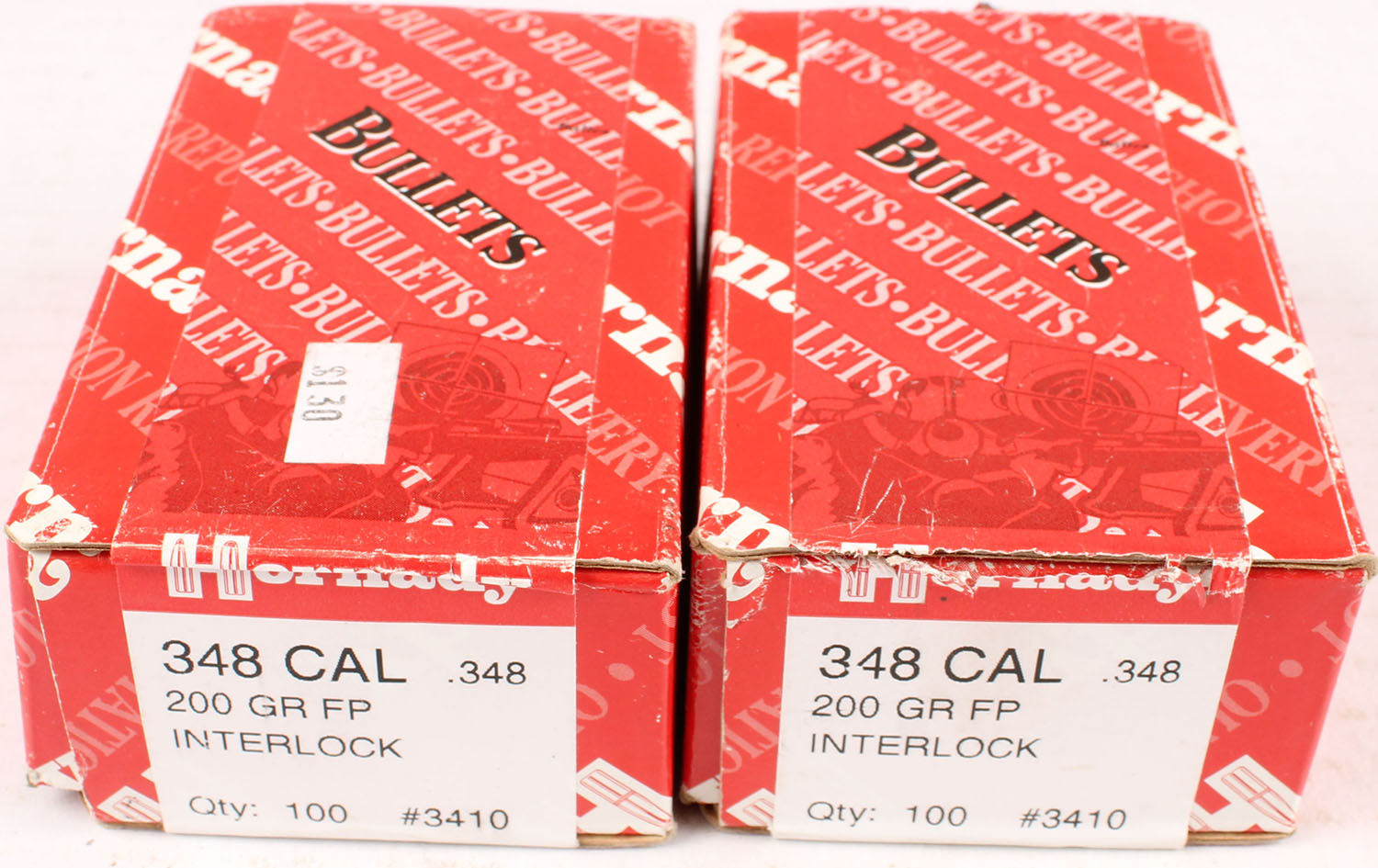 Hornady, Lot of (2) .348 Cal., 200 Grain Flat Point Interlock, (1) box FULL & SEALED), (1) box partial approx. half full, 1pc. Red & white boxes, boxes are solid with excellent color, labels are intact, bullets in open box are minty. Grade: Excellent - Value: 10 to 50