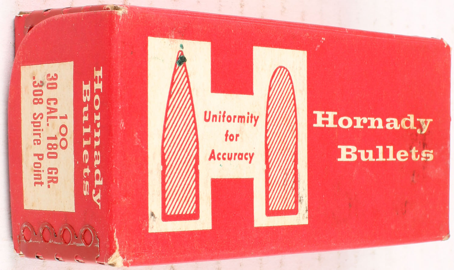 Hornady, .30 Cal., 180 Grain .308 Spire Point, Full, 1pc. Red & white box, box is solid with very good to excellent color, some age soiling, minor corner wear, edges are crisp, top flap is solid, bullets are excellent. Grade: Excellent - Value: 10 to 40