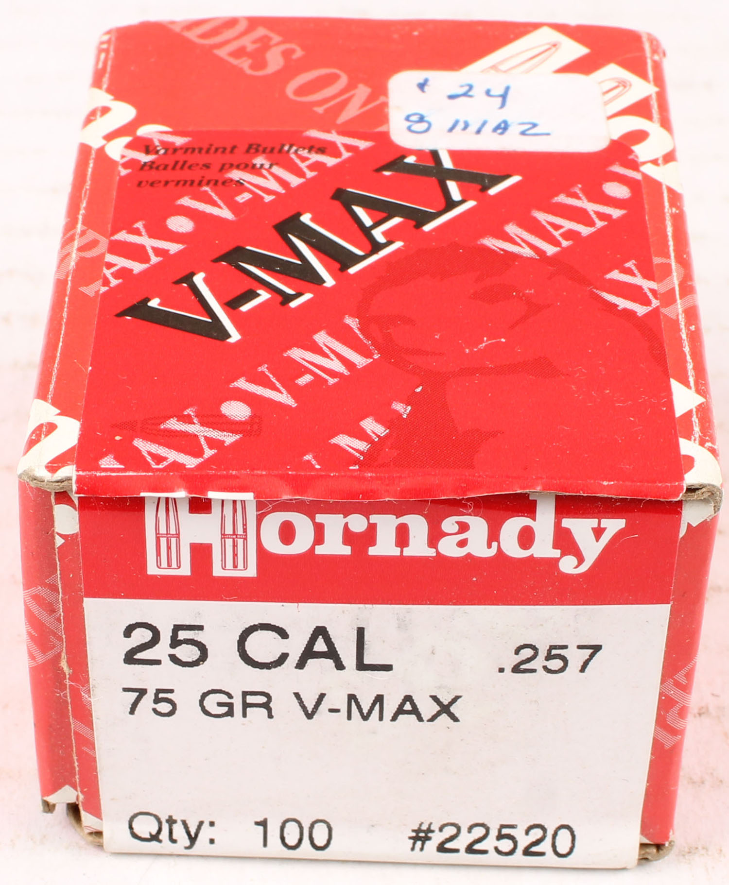 Hornady, .25 Cal., 75 Grain V-Max, Full, 1pc. Red & white box, box is solid with excellent color, very minor edge & corner wear, top flap is solid, bullets are minty. Grade: Excellent + - Value: 10 to 40