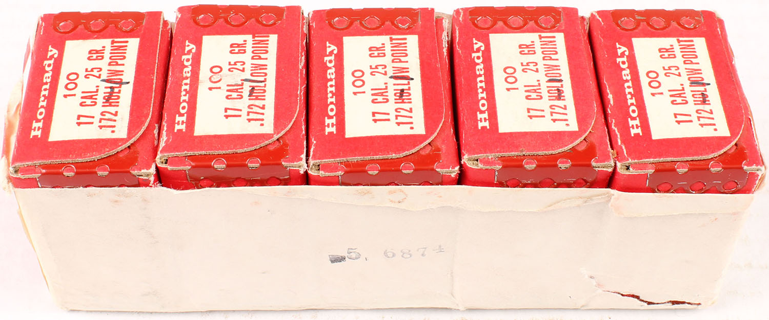 Hornady, .17 Cal. 25 Grain .172 Hollow Point, Full 500rds. Paper brick, brick is solid with mall tear on corner, inside boxes are FULL & SEALED, excellent. Grade: Excellent - Value: 30 to 90