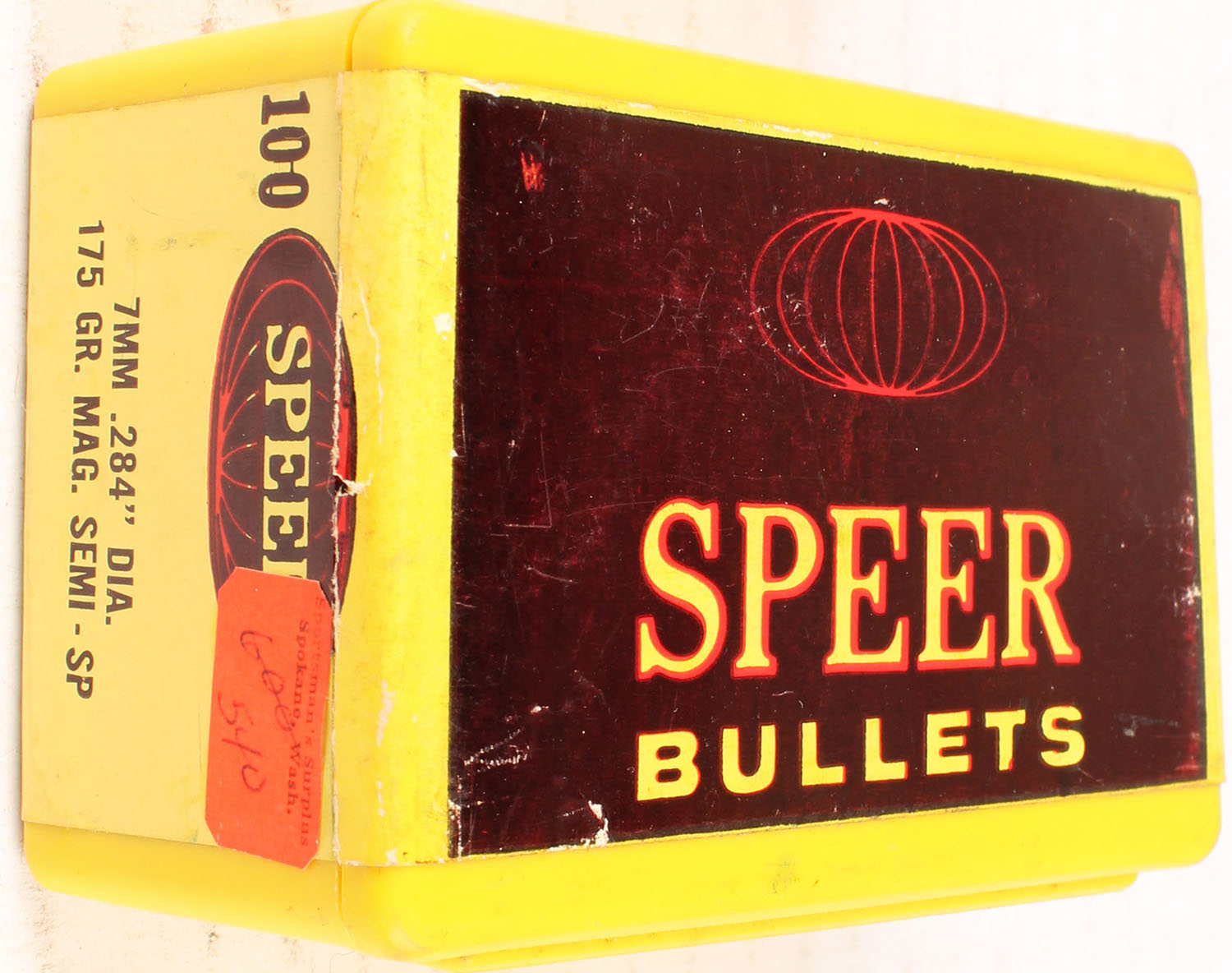 Speer, 7mm, 175 Grain Mag. Semi Soft Point, .284 Dia., Full, 1pc. Yellow plastic box with black & yellow sealing label, box is solid with excellent color, very minor shelf wear, bullets are minty. Grade: Excellent + - Value: 10 to 40