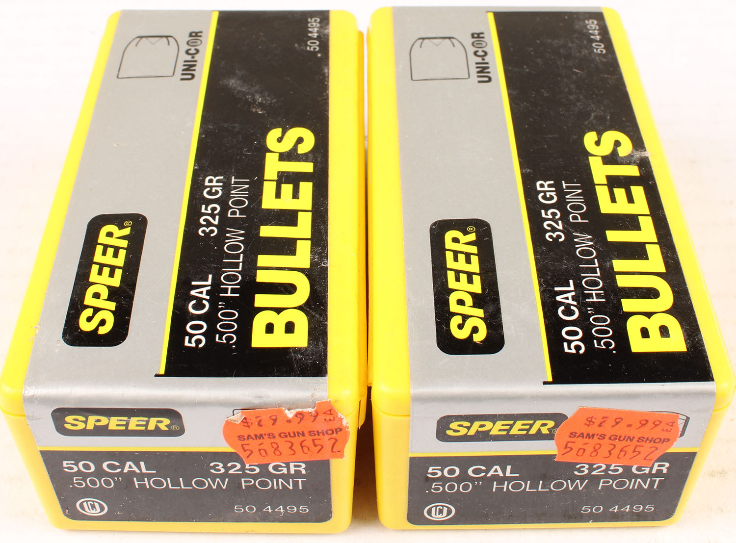 Speer, Lot of (2), .50 Cal., 325 Grain .500 Hollow Point, FULL & SEALED, 1pc. Yellow plastic boxes with black gray & yellow sealing labels, boxes are MINT with mint color, labels are intact. Grade: MINT - Value: 30 to 90