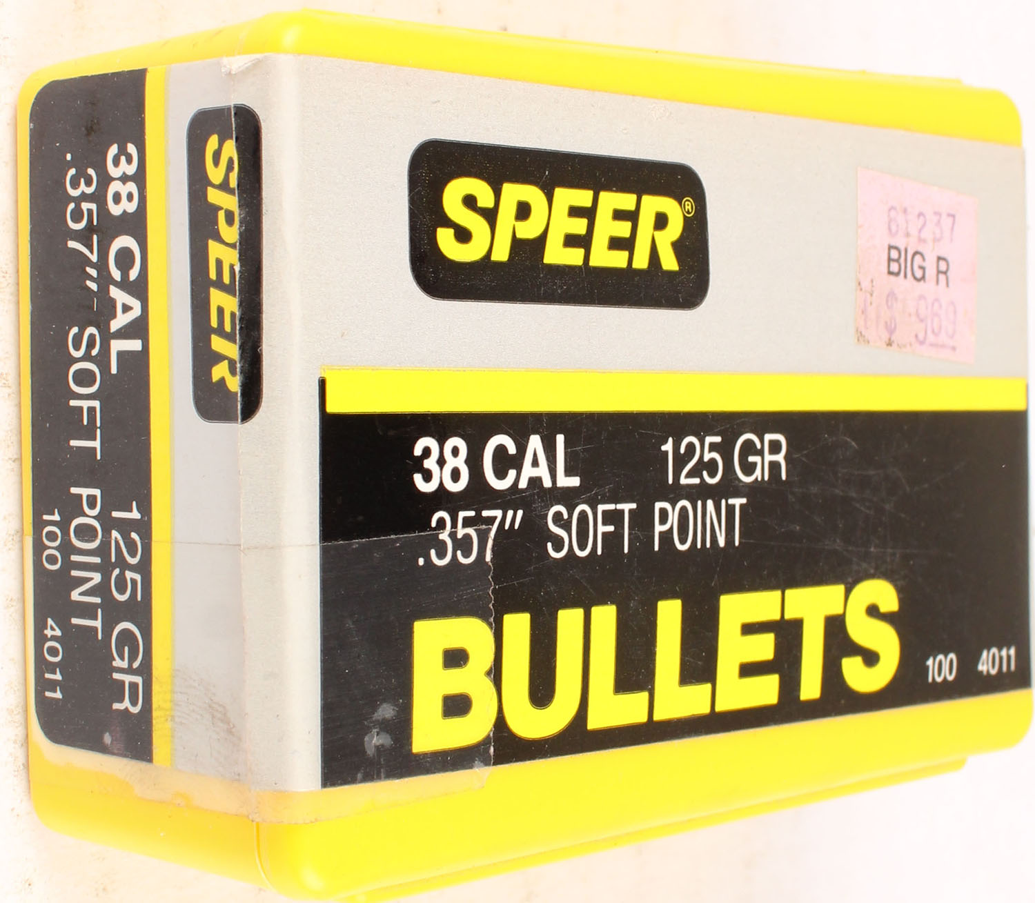 Speer, .38 Cal., 125 Grain Soft Point, .357 Dia., Full, 1pc. Yellow box with black gray & yellow sealing label, box is solid with excellent color, tape on left end, label is intact, bullets are minty. Grade: Excellent + - Value: 10 to 40