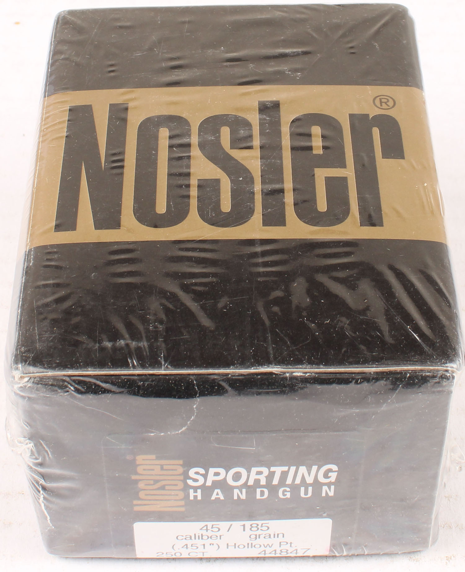 Nosler, Sporting Handgun, .45 Cal., 185 Grain Hollow Point, .451 Dia., FULL & SEALED, 1pc. Black & gold box, box is MINT with mint color, label is intact. Grade: MINT - Value: 20 to 60