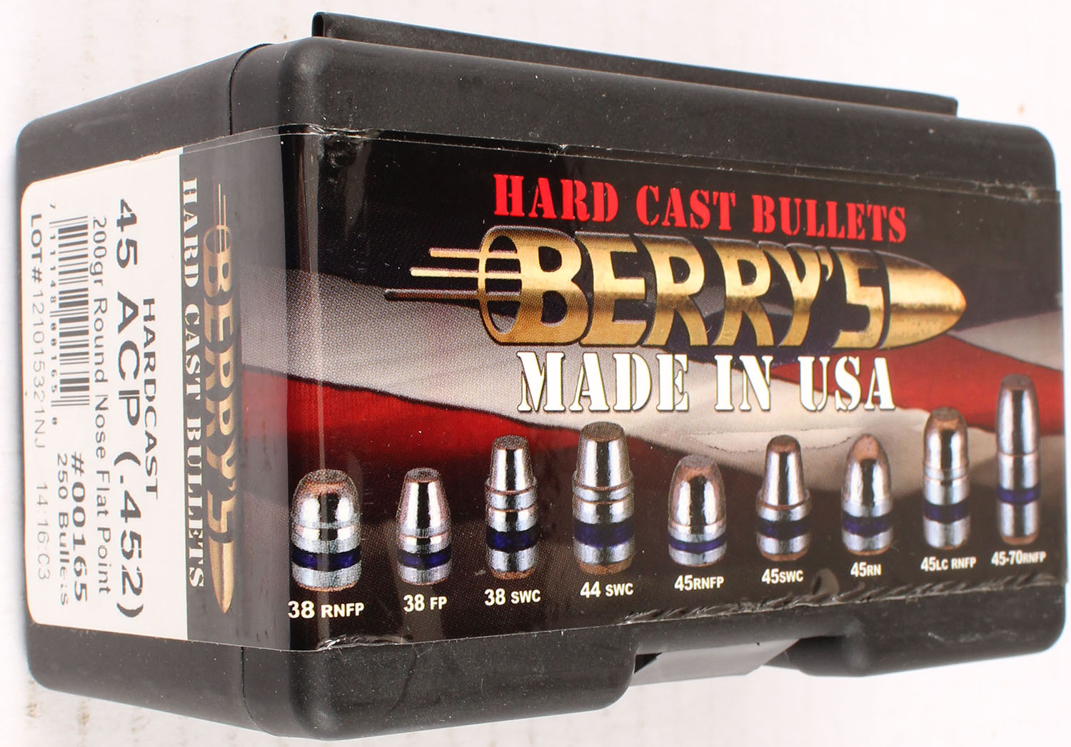 Berry's, Hardcast, .45 ACP, 200 Grain Round Nose Flat Point, .452 Dia., FULL & SEALED, 1pc. Black plastic box with multi-colored sealing label, box is MINT with minty color, label is intact. Grade: MINT - Value: 10 to 40