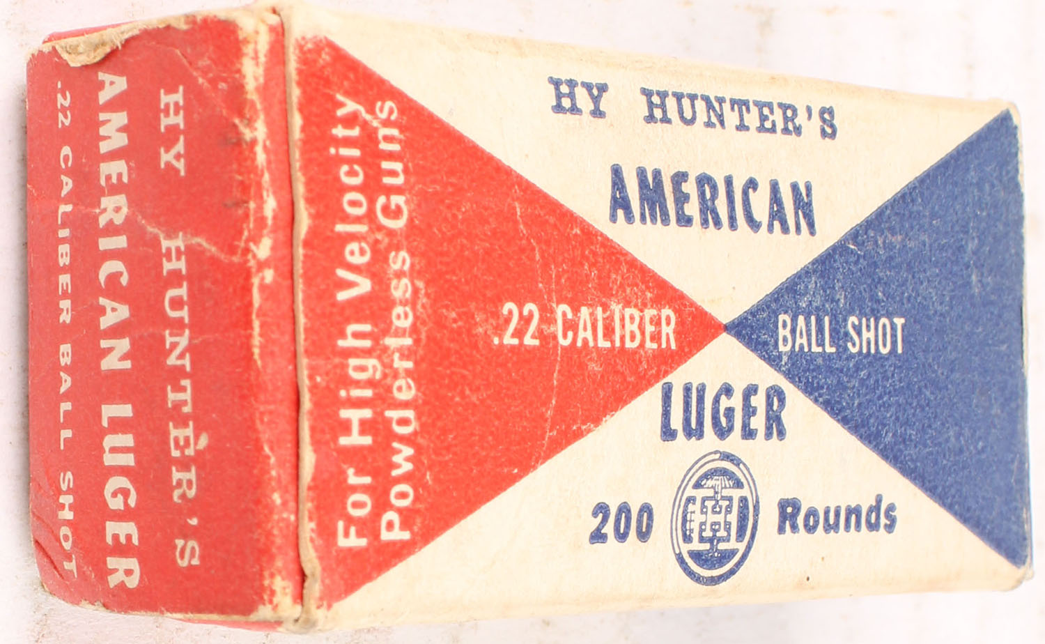 HY Hunter's, American Luger, .22 Caliber Ball Shot, Full, 1pc. White red & blue box, box is solid with very good color, minor age soiling & staining, minor edge & corner wear, end flaps are solid, lead is very good to excellent. Grade: Very Good ++ - Value: 10 to 50