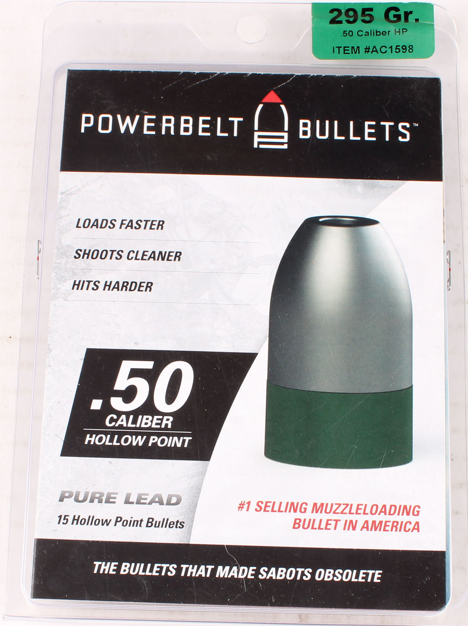 Powerbelt Bullets, .50 Cal., 295 Grain Pure Lead Hollow Point Muzzleloading Bullet, FULL & SEALED, 1pc. Plastic container, container & label are MINT, bullets are mint. Grade: MINT - Value: 6 to 30