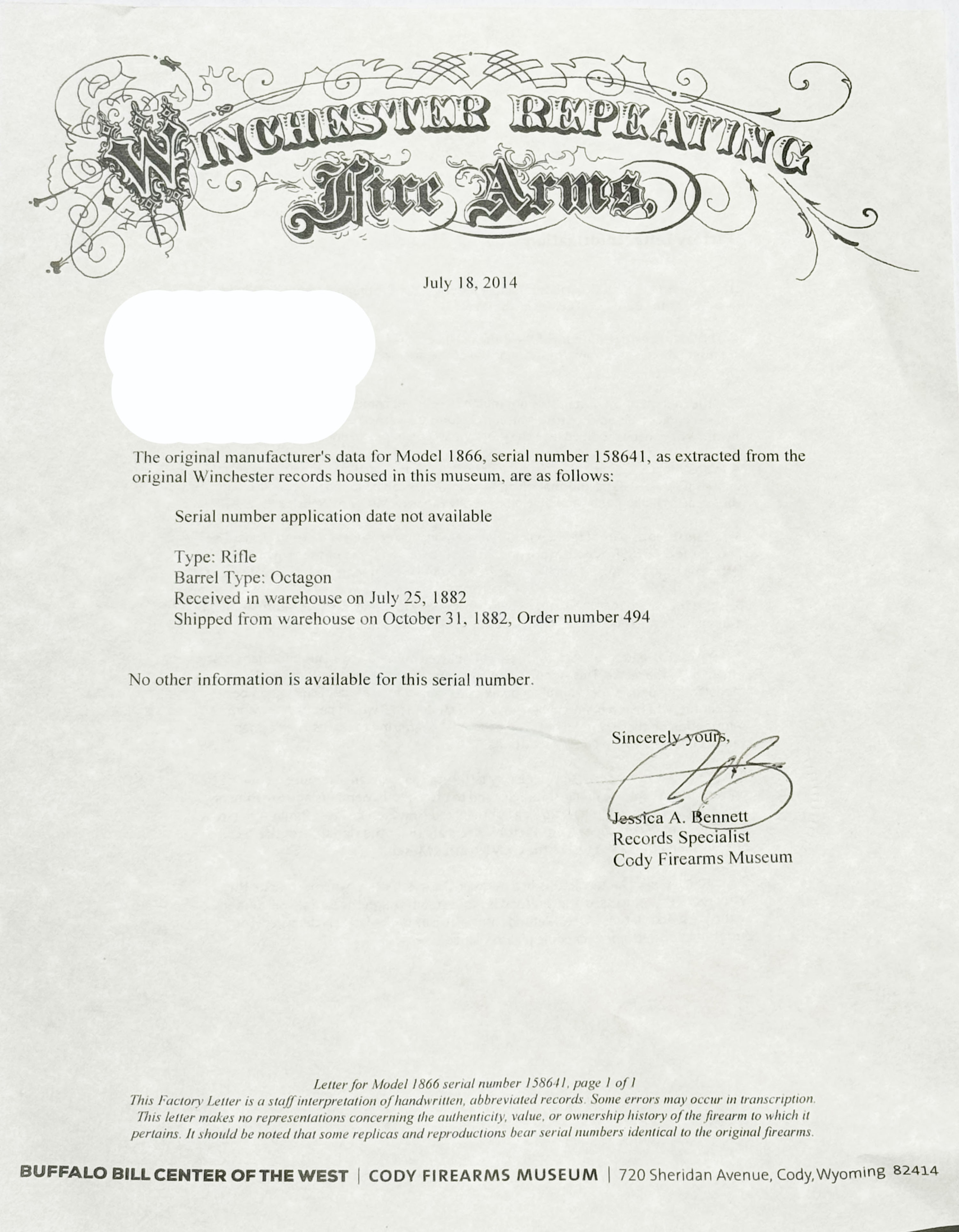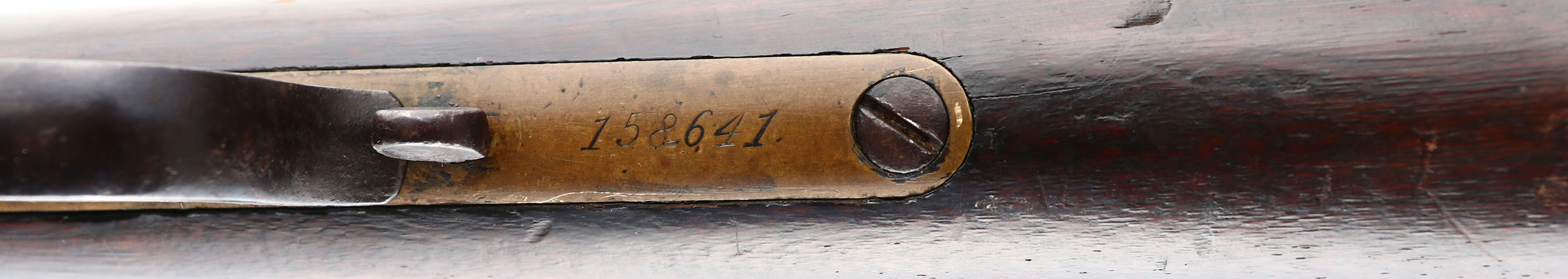 Winchester, Model 1866, Fourth Variation, .44 RF Cal., MFG. Antique, SN: 158641, Lever Action Rifle, 24 1/4'' Octagon barrel, Full mag. The wood stocks are very good & solid, despite a 1 3/4'' stress crack at the left side of wrist emanating from the receiver. The stocks display numerous small nicks, gouges & contusions, & have darkened appearance from age, use & oils. The metal finish on the barrel, mag tube, lever, forend cap & buttplate have fully toned to a full coverage dark chocolate patina. The brass receiver have a darker brown mustard tone & some staining. There are numerous small nicks, contusion & abrasions on the barrel, receiver & other metal parts all consistent with western frontier use. The receiver is missing one sideplate screw & appears to have at least one additional screw replaced. Bore is good, with some pitting & roughness amongst solid rifling. Barrel mounted with an adjustable rear & pinched blade front sight. Rifle has the sliding trapdoor crescent buttplate. Consistent with the 4th model, it has the italic SN stamped on the end of the lower tang. Comes with a Cody Winchester Factory Records letter confirming configuration & dates. This is a rustic survivor 1866, displaying all the character of authentic frontier use. Still a great antique brass rifle. Antique, No FFL Req. - Value: 2500 to 5000