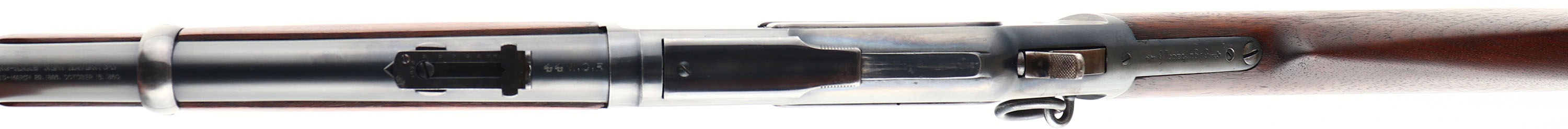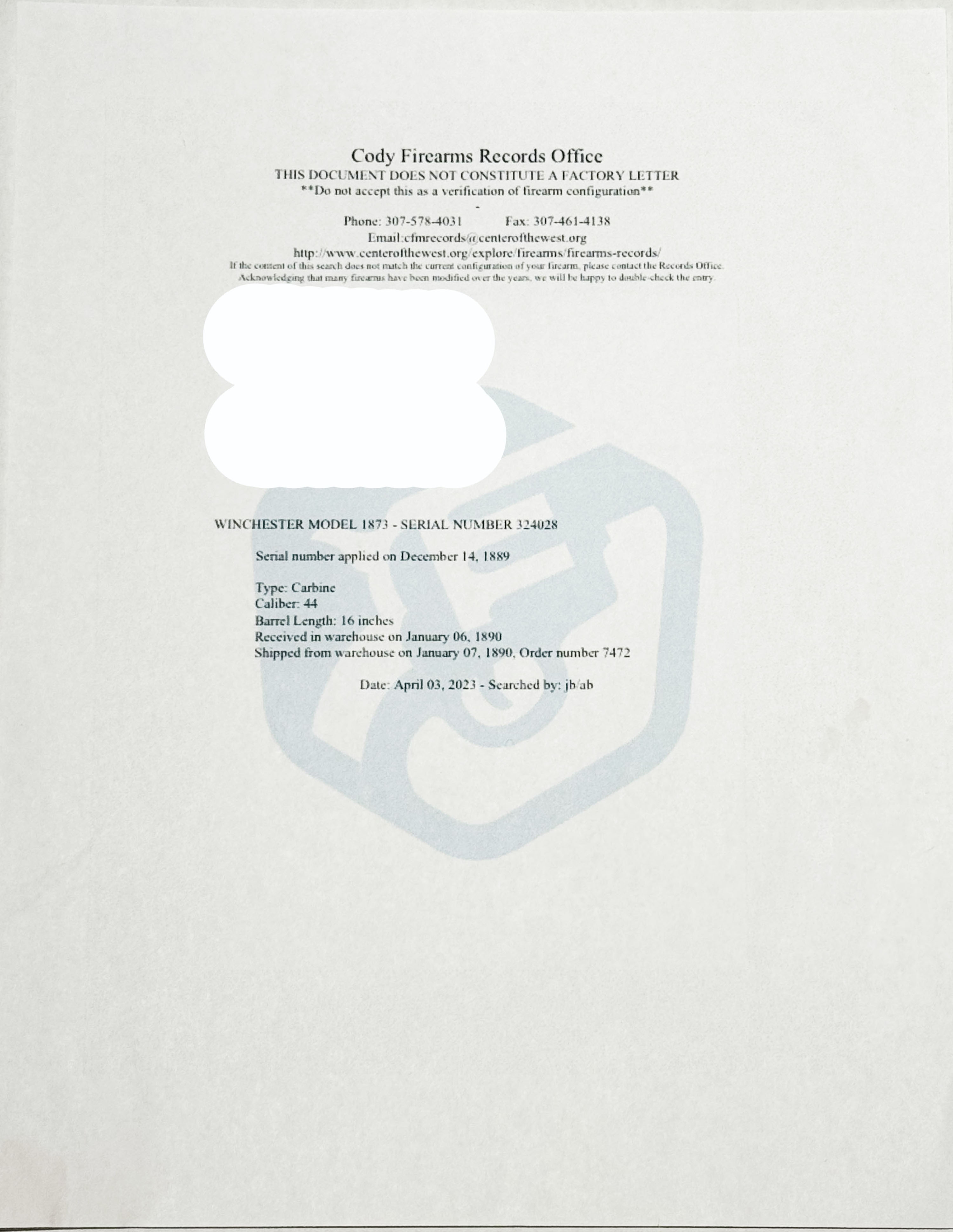 RARE Winchester, Model 1873 16'' Trapper (Baby Carbine) Saddle Ring Carbine, Third model, .44 WCF Cal., MFG: 1890, SN:324028, Lever Action Carbine, 16'' Round barrel, Full mag. This carbine was thoroughly & professionally restored back to factory standards. For most, it would pass as all original. The wood stocks are excellent, with virtually no handling marks. The Trapper 8'' length forend dost have a 2'' stress crack at the tip. Wood remains proud to the metal. The metal blue finish rates 99% overall. The case-hardened lever, buttplate & hammer display strong case-colors. The loading gate & dust cover have the correct oxide blue. Fitted with original 1873 ladder rear sight & box carbine front sight. Bore is excellent. Stock carries a sliding trapdoor carbine metal buttplate. The carbine come with a Cody Winchester lookup sheet, which confirms dates & configuration. This is an overall excellent condition & very rare 1873 SRC trapper, which is very collectible.* NO FFL Req. - Value: 12000 to 20000