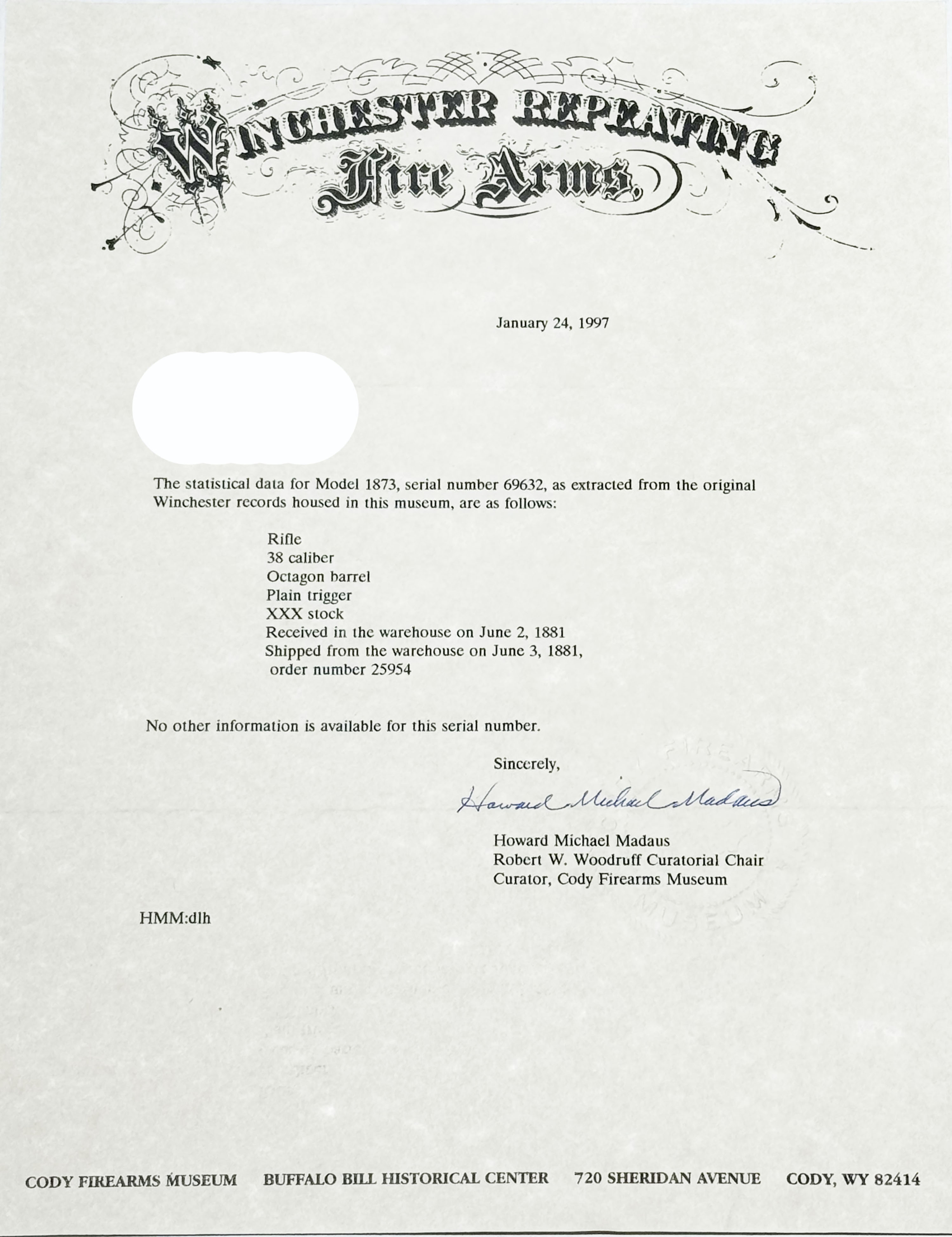RARE Special Order Winchester, Model 1873, 2nd model, 38 WCF Cal., MFG: 1881, SN: 69632, Lever Action Rifle, 24'' Octagon barrel, Full mag. The special order XXX original wood stocks are excellent, displaying fabulous tiger striped grain. They carry the original finish, with an added protected layer. Finish shows some spotty haze to the stock & wear loss to the forend, along with few handling marks. The original metal blue finish rates 80% on the barrel & 70% on the receiver, with the finish on the mag tube worn to a thin brown patina. Fitted with an adjustable rear & silver blade front sights. Bore is excellent. Stock carries a widow's peak shotgun metal buttplate. Comes with a Cody Factory Records Letter confirming configuration & dates. This is a fabulous presenting special order 1873 & is very desirable amongst collectors.* Antique, No FFL Req. - Value: 12000 to 20000