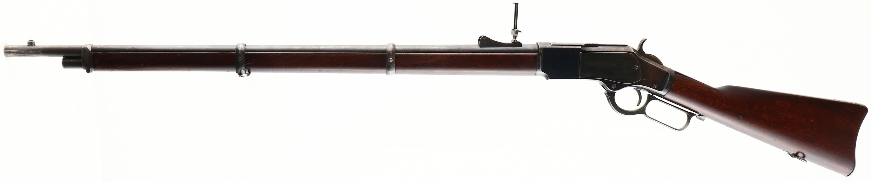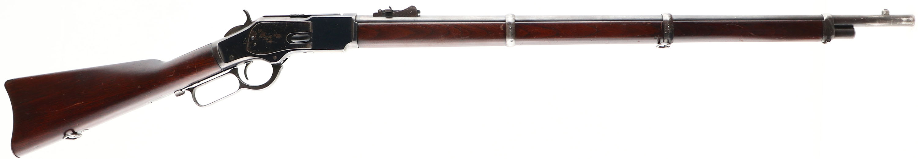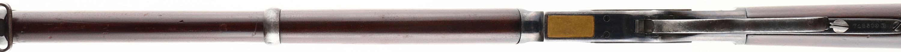 RARE Winchester, Model 1873 Musket, Third Variation, CAL: 44, MFG: 1917, SN: 718509, Lever Action Rifle, 30'' barrel, 27'' magazine tub. In all, over 720,000 Model 1873's were produced up until 1923 in three standard variations: a 24'' barrel rifle, a 20'' barrel carbine, & a 30'' ''musket'', which was aimed at military contracts. Production of Winchester Model 1873 Muskets only represented about 5% of all Model 1873 production (about 36,000 guns). Since the majority of the muskets were sold internationally, they are even harder to locate in the United States, as most never made it back to this country. The greatest popularity for the Model 1873 Musket was found in South American countries, where the guns were acquired by government & rebel forces alike during the later part of the 19th & early 20th centuries. Because most muskets left the country for these contracts, the Model 1873 Musket can be ''quite rare'' according to author George Madis. The original straight grip wood stock & musket length forearm are excellent, having been cleaned or possibly lightly sanded in areas & re-oiled to a dark rich tone. There are several minor contusions, scrapes & scratches. The stocks have an overall excellent appearance. The original metal finish on the barrel, with 80% of the high luster blue finish remaining on the receiver. Pitting on the left side panel has been cleaned & finish has been added. This level of retained blue on the rest receiver is rare amongst these muskets, as most have lost all blue & have toned to a brown patina. The barrel has worn thin & toned to a brown patina, with remnants of blue in protected areas. Bore is excellent, with some light spotting of along rifling edges. The bottom of the brass cartridge lifter is stamped .44 CAL. In italics, & the top of the barrel, just in front of the receive is stamped 44 CAL. The upper tang is marked with the standard mid-production MODEL 1873 mark. The top of the barrel is marked with the two-line address & patent information ''WINCHESTERS-REPEATING-ARMS NEW HAVEN CT., KINGS-IMPROVEMENT-PATENTED-MARCH 29, 1866. OCTOBER 16, 1860.'' The barrel holds the original musket pattern rear sight & the front sight/bayonet lug. Original sling swivels. The original 3rd model dust cover & integral rails are in place on the top of the receiver & the dust cover operates smoothly. Buttstock carries a sliding trapdoor, smooth metal buttplate with a 5 piece cleaning rod inside. This is an overall excellent example of a fairly rare 1873 Musket rifle. A wonderful collectible. FFL or C&R Req. - Value: 4000 to 8000
