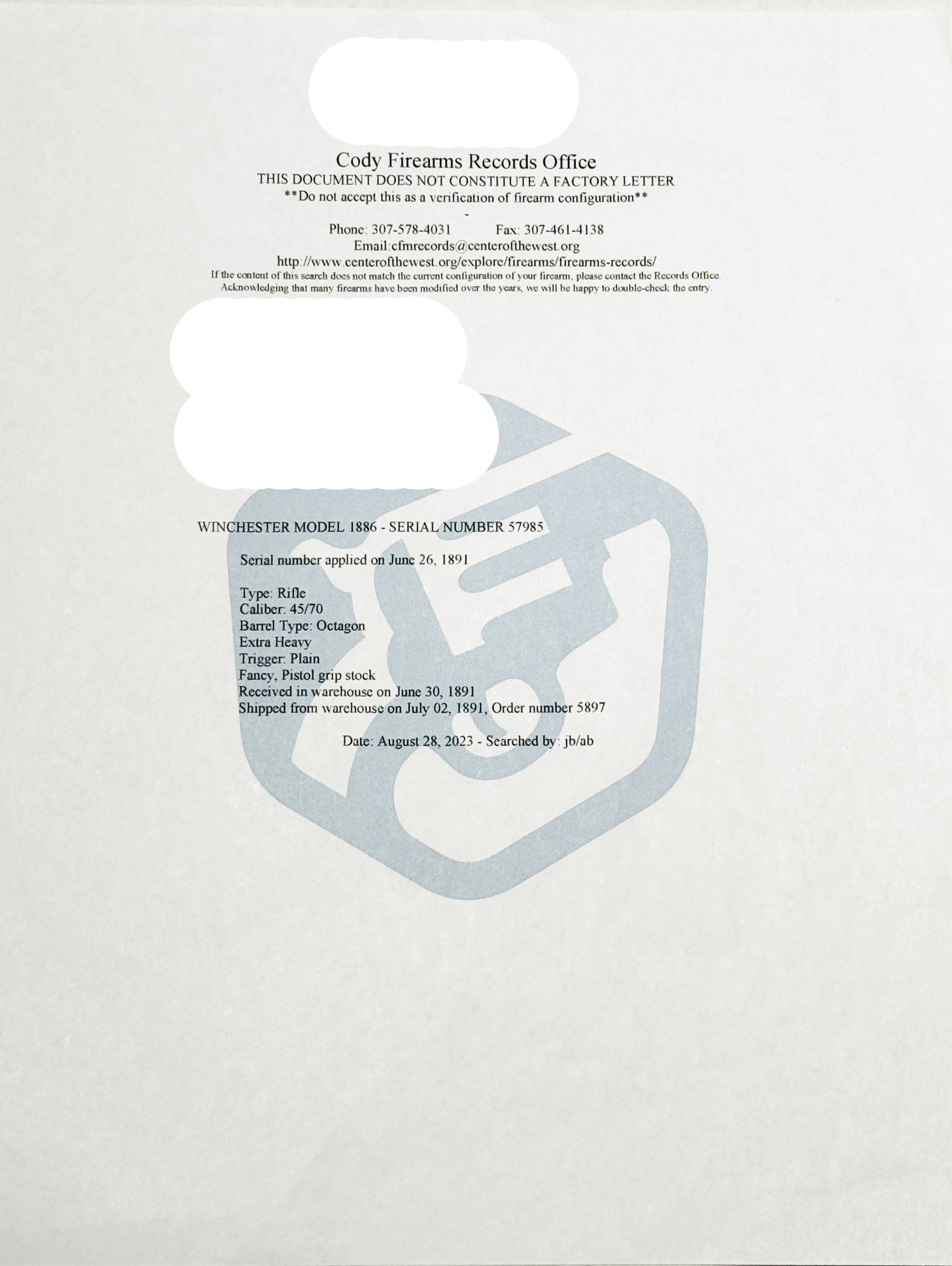 SPECIAL ORDER Winchester, Model 1886, 45-90 W.C.F., MFG. 1891, SN: 57985, Lever Action Rifle, SPECIAL ORDER 26'' EXTRA HEAVY Octagon barrel, Full mag. This rifle has been professionally restored. The fancy pistol grip stock, with ebony inlay, & forearm display fantastic flame & feathered grain. They appear to have their original finish, with a thin added layer on top for protection. They overall appearance is excellent, with very few tiny contusions or handling marks. The metal blue finish has been restored & rates 99% on barrel & mag. The case-hardened receiver has had some polishing done to it, but the receiver, lever & hammer still display outlines of the faded case-colors. The sliding bolt & loading gate retain a 90% of their original bright blue. The receiver is fitted with a Lyman tang sight, while the barrel carries an adjustable rear & small blade front sights. Bore is excellent. Stock carries a crescent metal buttplate. Comes with a Cody Winchester Factory Records Look-up sheet, which confirms special order configuration of the extra heavy octagon barrel & ''Fancy'' pistol grip stocks & production date. However, the caliber in the lookup sheet is listed as a 45-70, which is believed to be an error or legibility issue in the hand written records. There is two main reasons for this as the consigner indicates the underside the barrel also carries a ''45-90'' Winchester stamping & it has a bore twist rate of 1/32'' 45-90 bore instead of a 1/22'' 45-70 bore. Regardless of the caliber discrepancy, the rifle present extremely well & is very rare as an extra heavy weight barreled & non-checkered pistol grip deluxe antique rifle. An excellent special order & collectible 1886.* NO FFL Req. - Value: 8000 to 16000