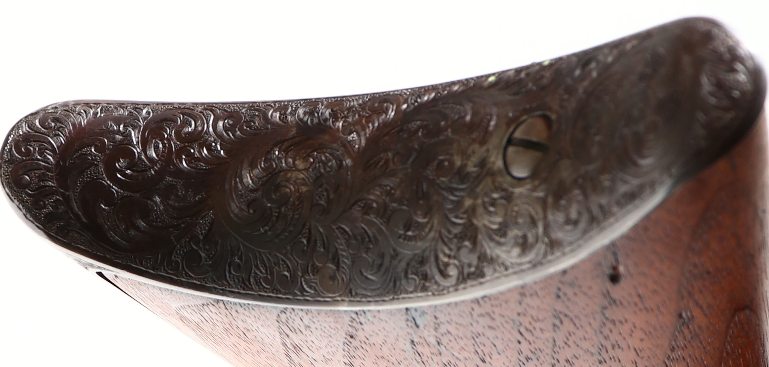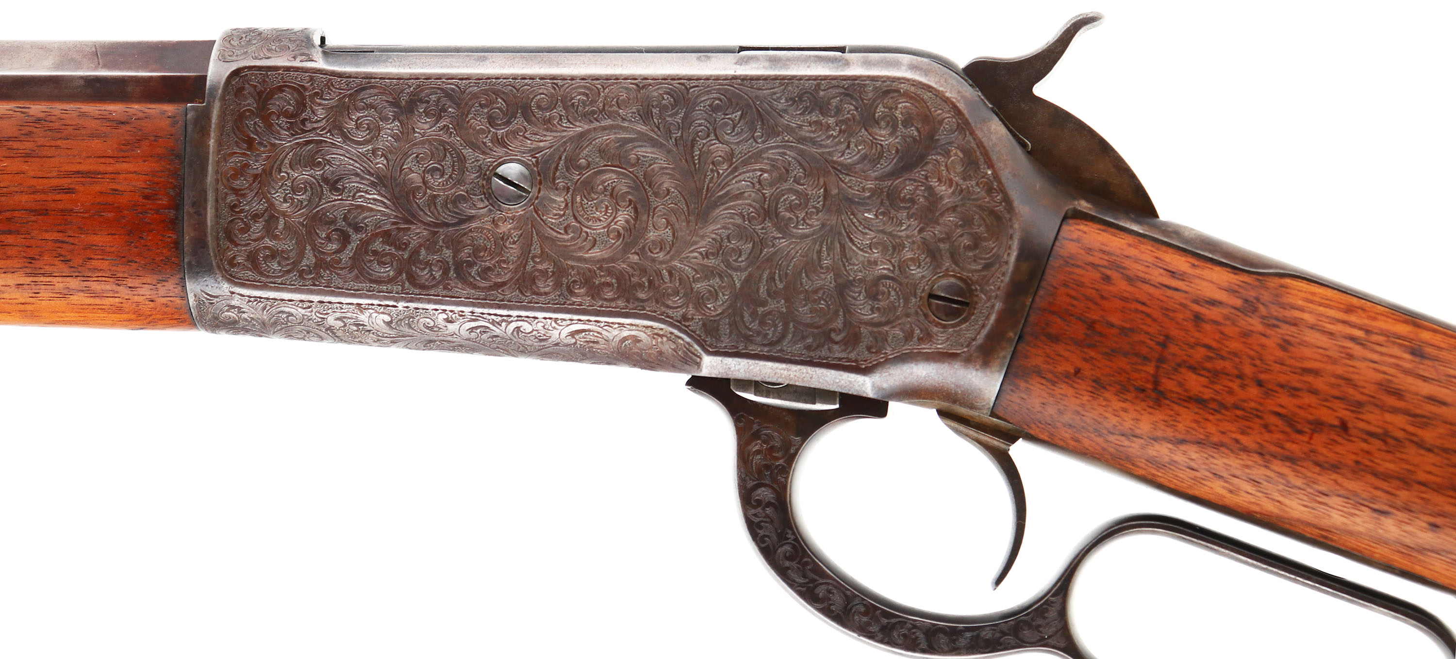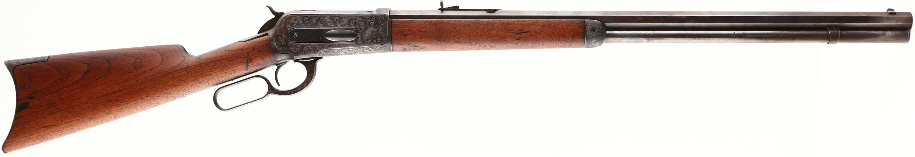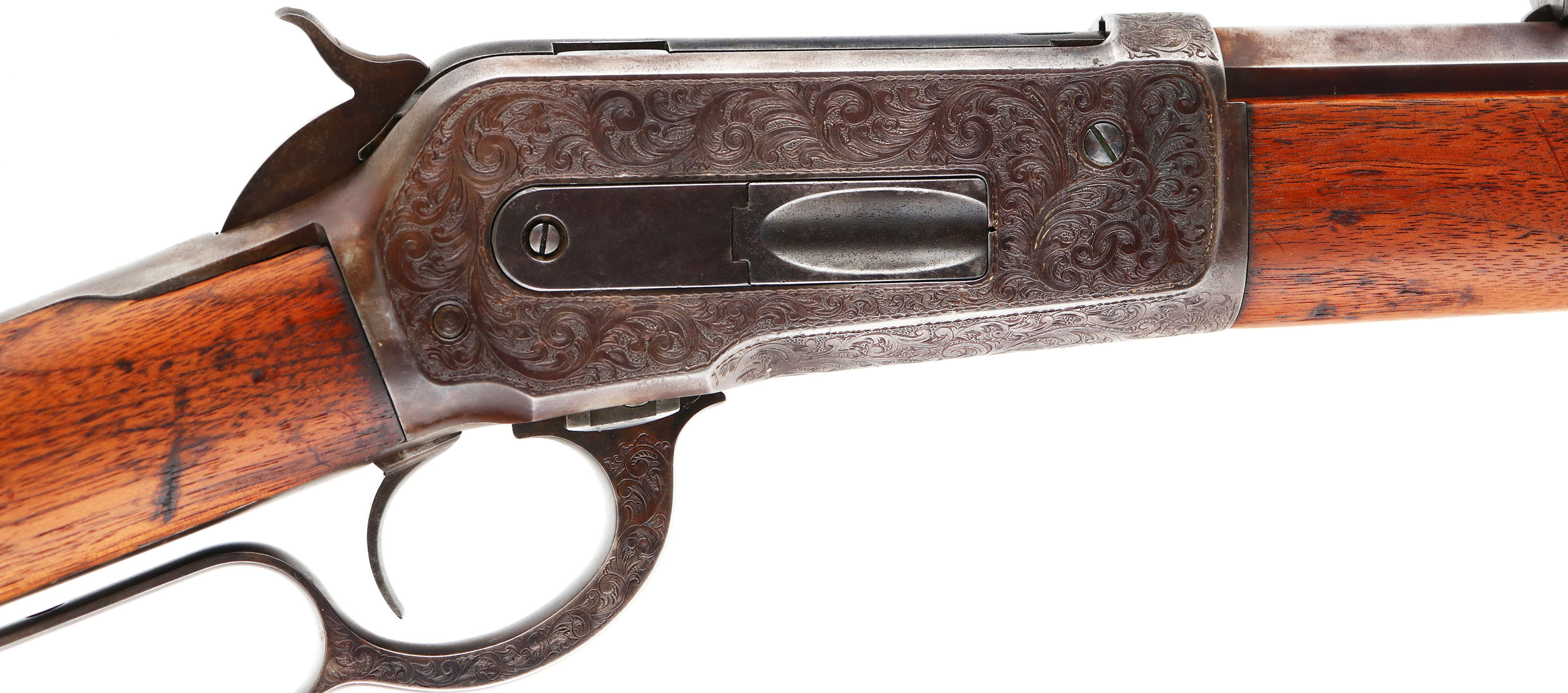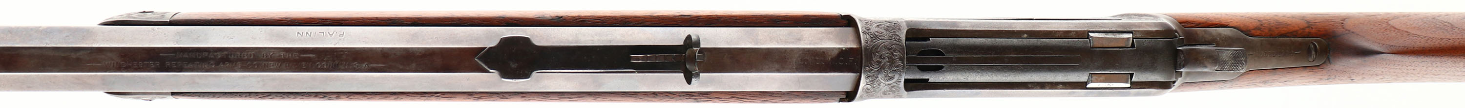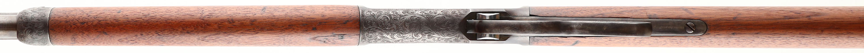 ENGRAVED Winchester, Model 1886, .40-82, MFG. 1893, SN: 80454, Lever Action Rifle, 26'' Octagon barrel, Full mag., This unique rifle was beautifully engraved by Master Engraver Ralph W. Ingle. Ingles unique high-relief scrollwork with stippled matte background is featured on the receiver, buttplate, forend cap, lever, & screws. The rifle was then refinished to give it an authentic vintage appearance. The wood stocks are very good, having been cleaned & refinished. They still display several small scuffs, scrapes & contusions, along with some of the original staining. There is a sliver of missing wood at the right shoulder where the wrist meats the receiver. The metal was refinished with an aged patina complementing the vintage style engraving. The loading gate & top of the bolt retains the original blue. The finish also shows spots of wear & areas of thinning, mostly on the barrel & mag tube. There are spotty areas of pitting & chattering on both the barrel & mag. Standard front & rear sights. Bore is fair, with worn rifling amongst pitting & scarring. There is also a ring in the barrel about 3'' from the muzzle. Stock fitted with a crescent metal buttplate. Desirable for those who appreciate the beauty & quality of a finely engraved firearm, which still retains a more authentic worn & vintage appearance. Antique, No FFL Req. - Value: 6000 to 10000