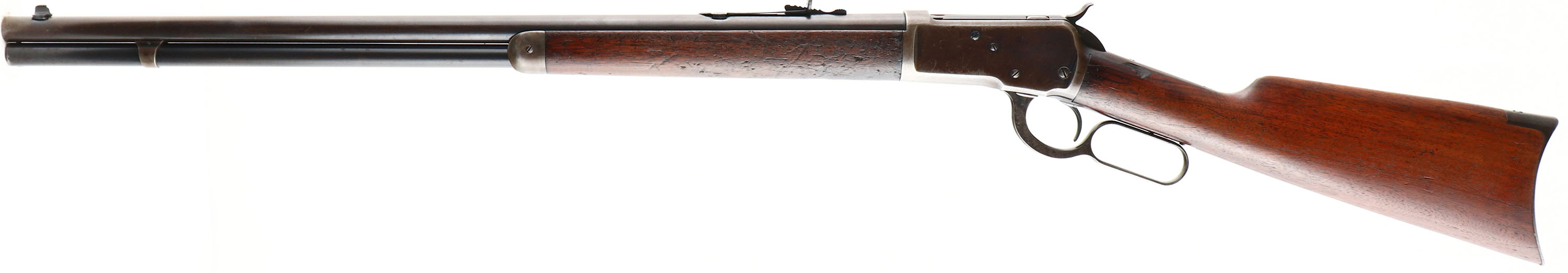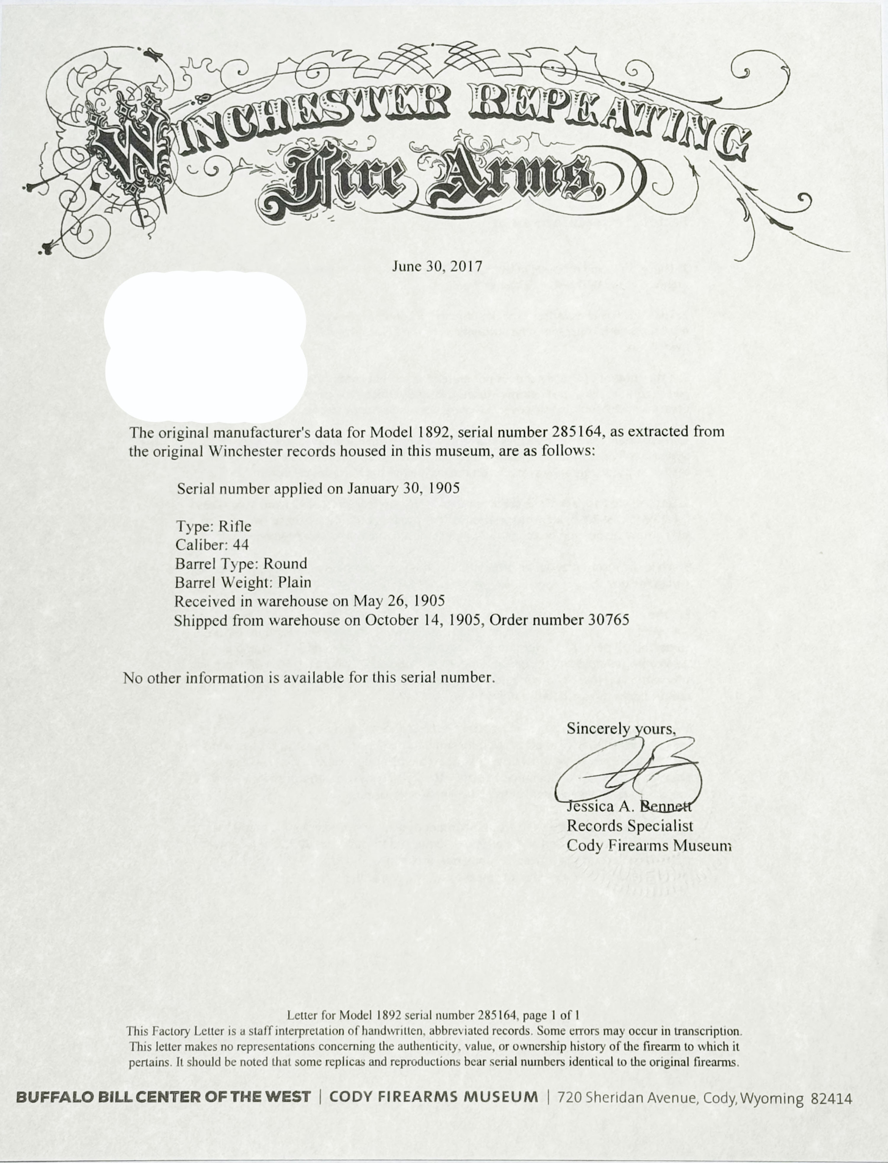 Winchester, Model 1892, CAL: 44 WCF, MFG: 1905, SN: 285164, Lever Action Rifle, 24 1/4'' Round barrel. Full mag. The original straight grip wood stocks are very good & solid. There are a couple of short hairline cracks at the buttend emanating from the buttplate & a 1'' glued chip repair at the left corner of the wrist & receiver. There is also a 1'' long gouge behind the chip repair. There are numerous small dings, minor scratches, scrapes & contusions to the wood, especially to the underside & left side of the forend. The stock carry the original finish, with thinning at the wrist & forend. The original metal finish on barrel is thinning & toning to a brown patina, with about 50% coverage & the remaining blue located on the more protected underside. The mag tube retains 80% of the original blue. The receiver has worn to a combination of gun metal gray & a thin brown patina. Bore is very good. The rifle is fitted with an adjustable rear sight & small blade front sight with an ivory bead. Buttstock carries a smooth crescent metal buttplate. Smooth tight action. Comes with a Cody Winchester Factory Letter confirming configuration & date. A great hunting, shooting & quality original example. FFL or C&R Req. - Value: 1500 to 3000