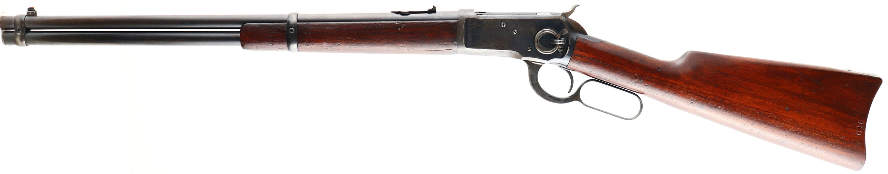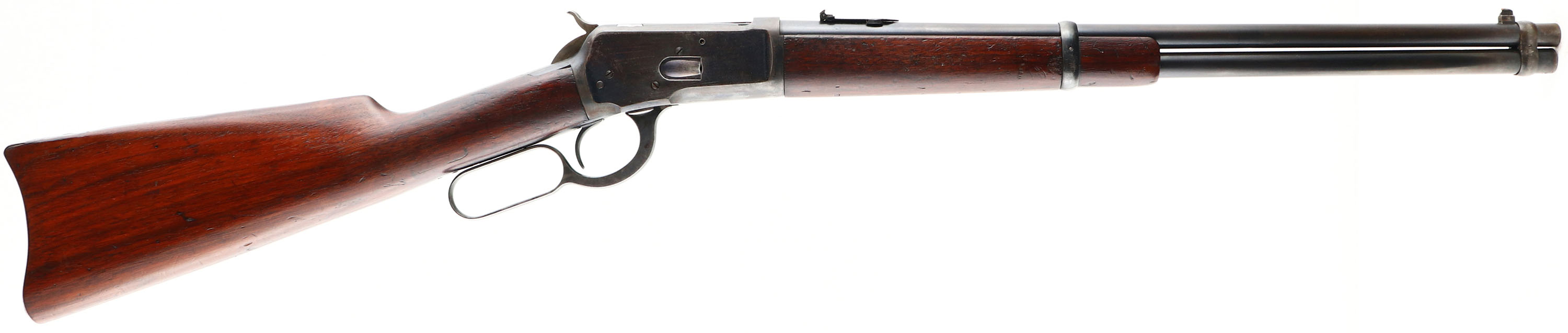 WONDERFUL Winchester, Model 92 SRC, marked 44 WCF, MFG. 1893, SN: 16239, Lever Action Carbine, 20'' Round Barrel, Full mag. Early 2nd year production antique SRC. The replaced buttstock & original forend are excellent & solid. They carry the original finish, with numerous light to small handling blemishes, scuffs or contusions. The left side of the stock carries a 1/4'' rack or inventory number ''016'' along the edge of the buttplate. The barrel & mag carry 90% of original factory blue, toning a bit grayish brown as it thins. The receiver carries 70% original blue, with typical striation loss & wear from the saddle ring rubbing. The case-hardened hammer & lever still display the remains of case-colors. Bore is very good, with some roughness amongst strong rifling. Barrel fitted with a three leaf rear sight & carbine box front sight. Metal carbine buttplate. Original saddle ring. Tight action. Comes with a Cody Winchester Letter confirming configuration & date. A great little carbine in original condition & very desirable in 44 WCF..* NO FFL Req. - Value: 7000 to 12000