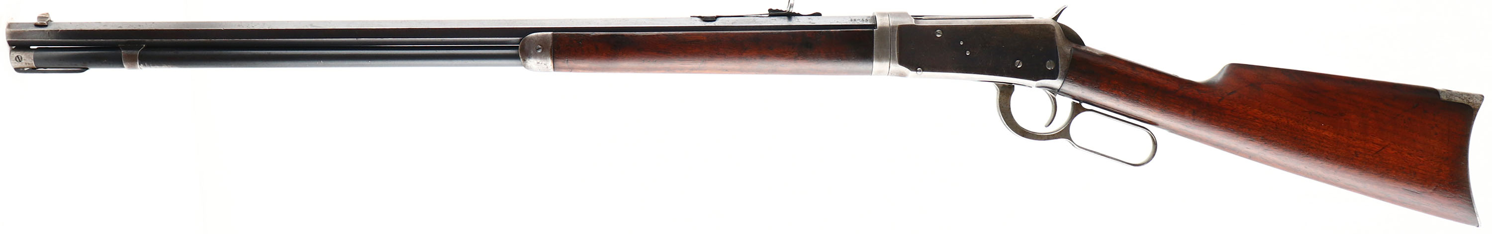 Winchester, Model 1894 TAKE-DOWN, CAL: 38-55, MFG: 1909, SN: 432797, Lever Action Rifle, 26'' Octagon barrel, Full mag. The original wood stocks are excellent, with a several minor handling marks, scuffs & contusions to the original finish, which is thinning at the carry points. The original factory blue is 85% on barrel & mag tube, while the receiver displays a mix of 25% remaining blue & the rest worn to thin brown patina & gun metal gray. The case-hardened lever & hammer have worn gray, with very faint case-colors. Bore is excellent. The barrel is fitted with a factory adjustable rear & pinch blade front sights. Metal crescent buttplate. Tight smooth action. An very nice original take-down rifle. FFL or C&R Req. - Value: 2000 to 4000