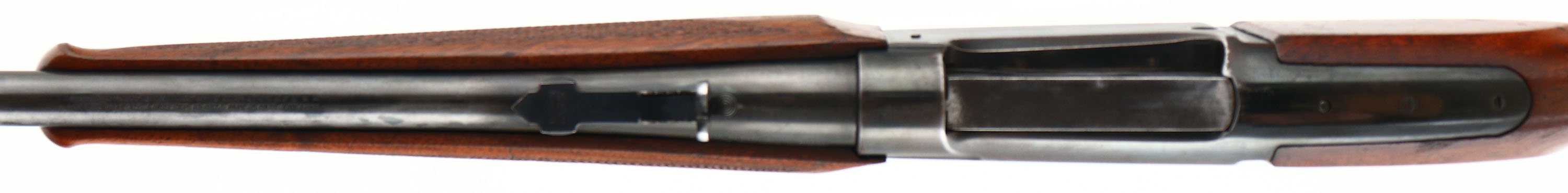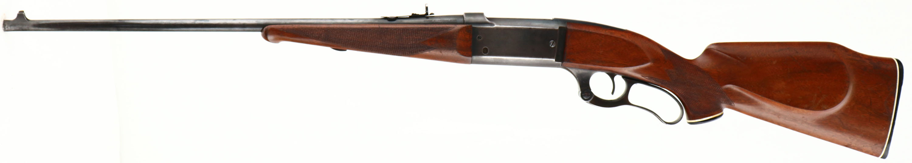 Savage, Model 1899 Take-down, marked 250-3000 Cal., MFG: 1923, SN: 246553, Lever Action Rifle, 22'' Tapered round barrel. The Bishop replacement checkered, cheeked & capped pistol grip Monte Carlo wood stocks are excellent & solid. The checkering on the wrist & beavertail forend appears original & are excellent, but there is a diamond at the wrist on both sides which appears to be added with a stippled background. There are numerous small scratches, scuffs & dings to what appears to be the original finish, which also shows some thinning & flaking. The metal blue finish on the barrel & receiver rates 50%, with spotty areas of loss or wear that is toning to a thin brown patina. The case-hardened lever displays the remains of muted case-coloring. Barrel fitted with a Marbles full buckhorn adjustable rear & original blade front sights. Bore is very good, but with some haze & roughness amongst solid rifling. The stock carries a white line serrated plastic buttplate, which matches the cap on the pistol grip. Action remains solid & tight. Great overall appearance. FFL or C&R Req. - Value: 600 to 1200