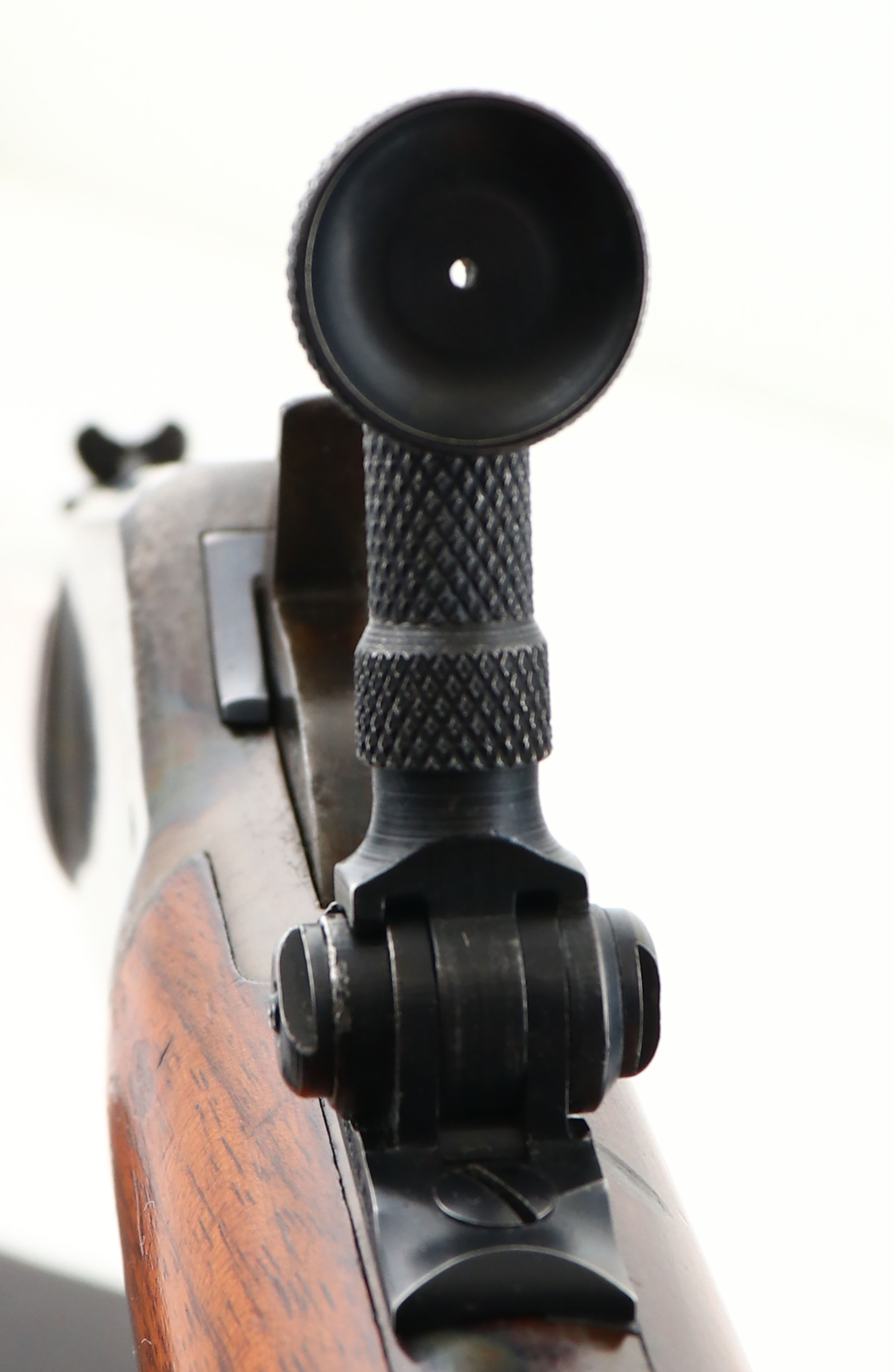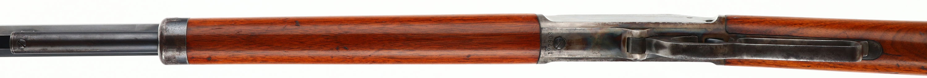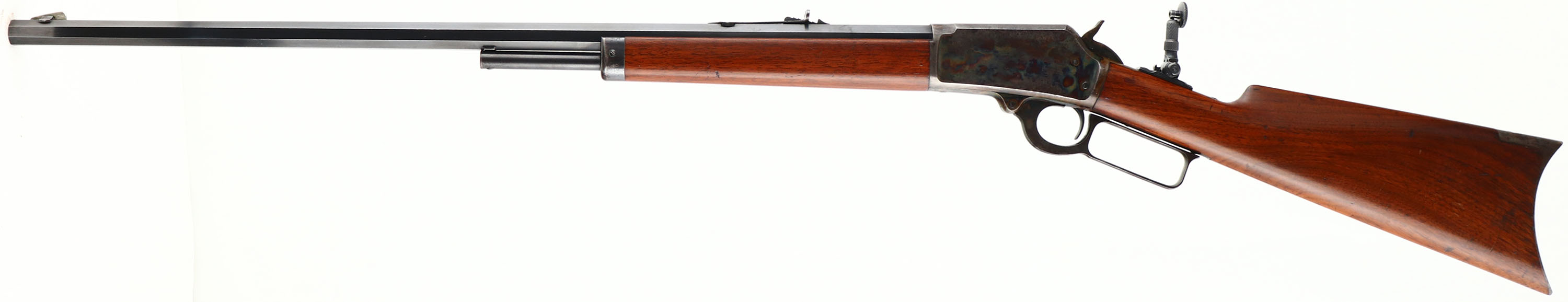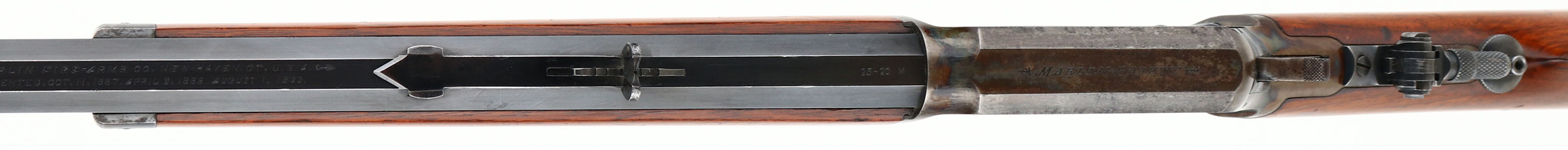 Marlin, Model 1894, marked .25-20 M Cal., MFG. 1900, SN: 197903, Lever Action Rifle, 26'' Octagon barrel rather than the standard 24''. Half mag. The original straight grip wood stocks are excellent, with several minor scratches, scrapes & contusions to the original factory finish. The original metal blue finish is 95% on the barrel & 60% on mag tube. The case-hardened receiver, lever, hammer & buttplate all display strong to faded case-colors. Bore is very good & bright. Rifle fitted with a Marbles flip-up tang sight with lard aperture disk, standard adjustable rear & Sheards long blade front sight. Crescent metal buttplate. Strong eye appeal on this all original & overall excellent 1894 rifle. FFL or C&R Req. - Value: 2500 to 4000