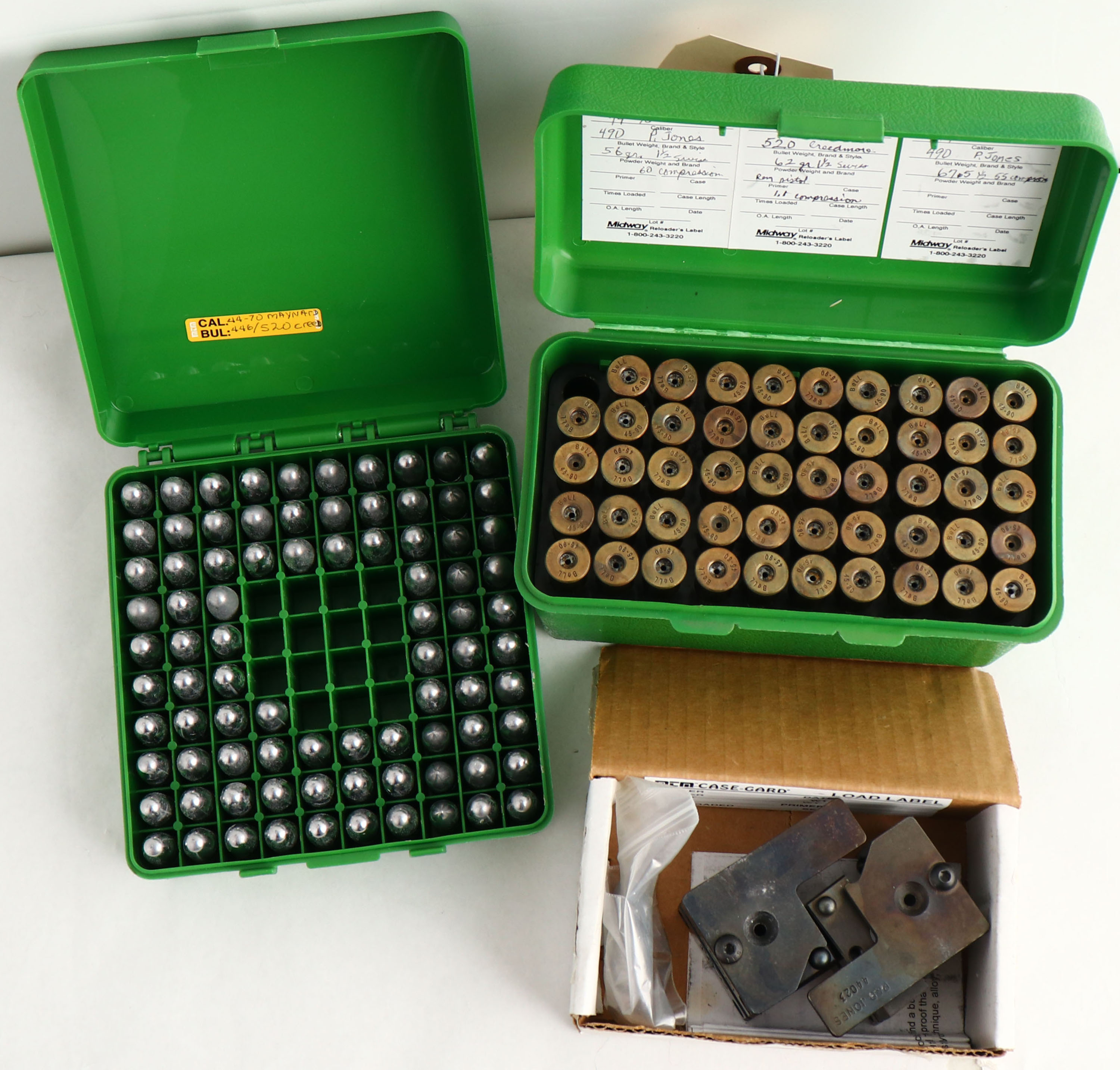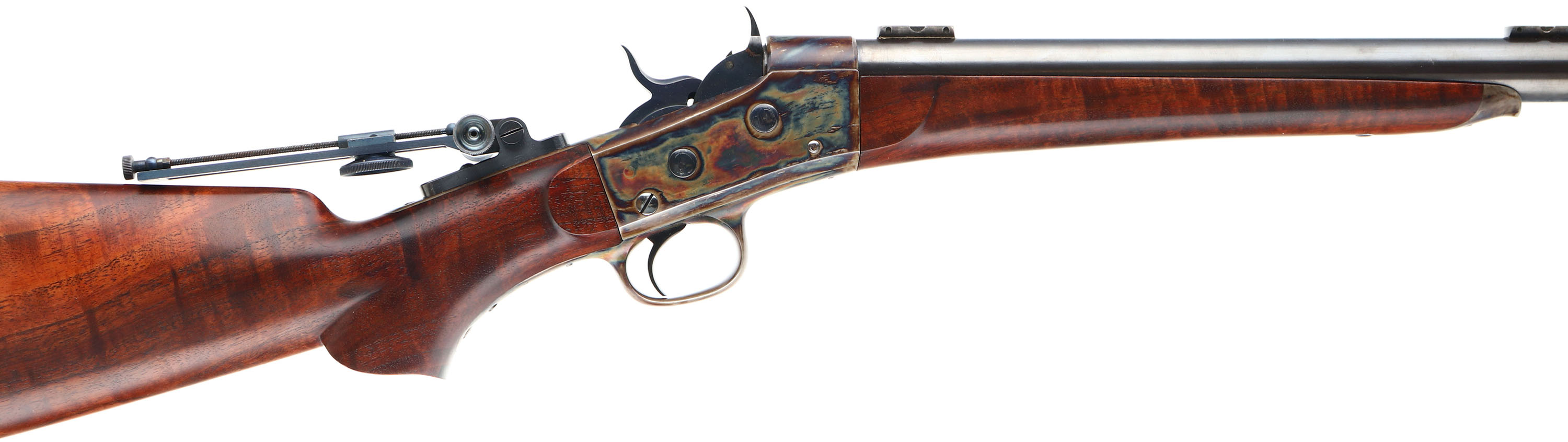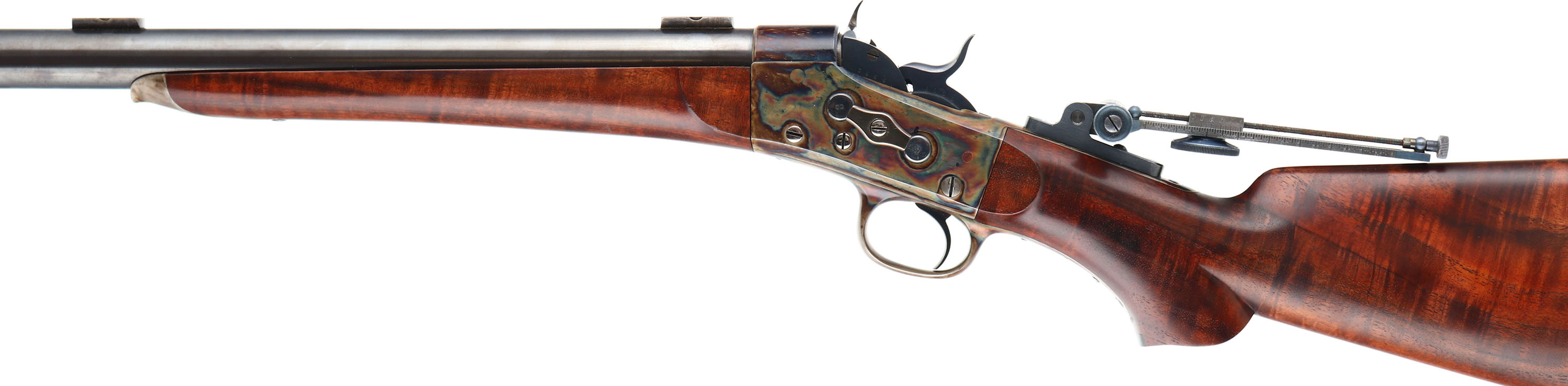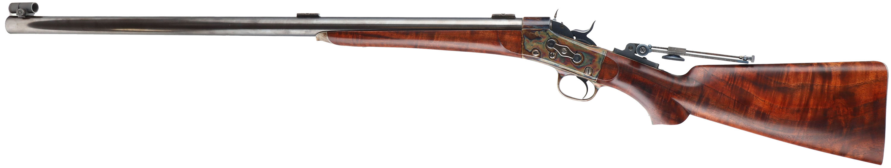 CUSTOM Remington Rolling Block Rifle, 44-70 Maynard Cal., MFG Antique, SN: 7666, 30'' Badger round heavy bull barrel. The metal blued finish barrel is starting to tone gray, but retains 95% coverage. The breechblock, hammer & trigger are blued. The case-hardened receiver displays vivid & beautiful case-colors. The rifle is mounted with a smooth forearm & stock. Forend carries the standard Creedmoor iron cap. The scalloped pistol grip stock carries an ebony insert in the base of the pistol grip. The stocks are excellent, with fantastic scalloped grain.& excellent finish. The stock caries a case-hardened widow's peak smooth metal buttplate exhibiting excellent case-colors. The upper tang of the receiver carries a long range vernier tang sight with large aperture, while the barrel carries a silhouette front globe sight. Bore is excellent & bright. Serial # is marked on the lower tang, The rifle comes with two high quality Buffalo Arms Co. 44 cal. 44-70 Maynard bullet molds, with a sample lead bullet, 49 rds of unprimed empty brass cases head stamped Bell 45-90, & 86 cast lead bullets in a case marked .446 520 gr. Creedmoor. This is a an overall excellent & sharp looking custom Remington rolling block. Antique No FFL Req. - Value: 1200 to 2500
