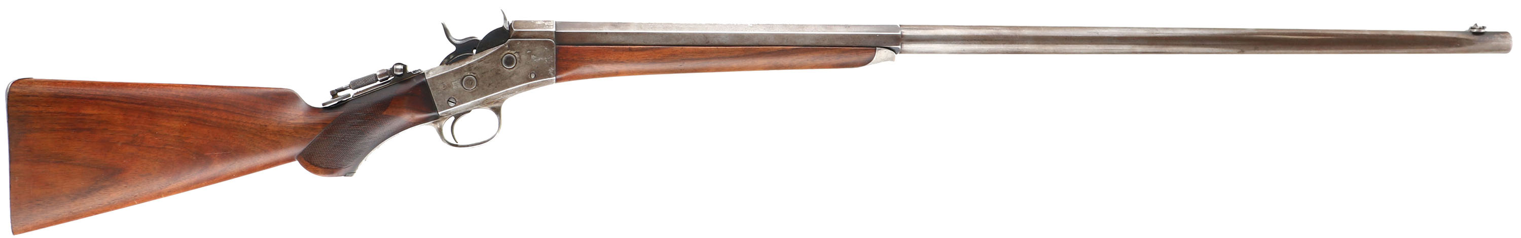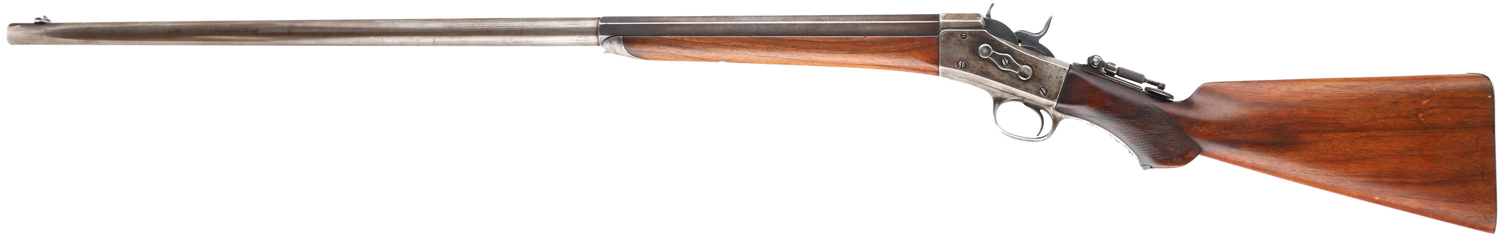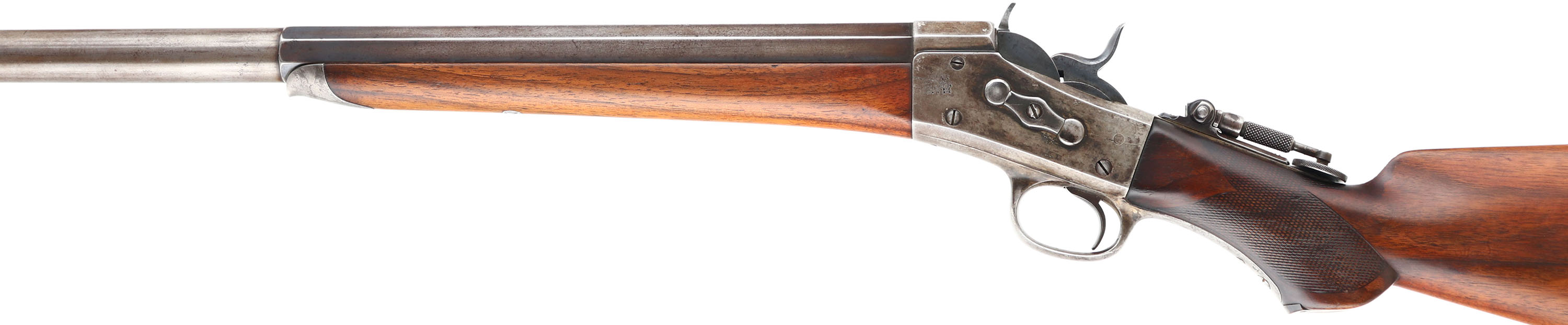 CUSTOM Remington Rolling Block Creedmoor Long Range Target Rifle chambered in 44 S Cal., MFG: 1873-79, SN: 5834, 34 3/8'' Octagon to round barrel. The bottom of the barrel in front of the forend cap is marked ''44 S'', usually this is .44-77 Rem, but could be .44-90. The top of the barrel is marked ''E. REMINGTON & SONS.ILION.N.Y.'' & the serial # is marked on the lower tang, on the underside of the barrel under the forend & on the buttend of the forend. The firearm has a blued 1/3rd octagon to round barrel, which has worn to mostly gun metal gray with a thin brown patina. The breechblock, hammer & trigger are blued. The receiver appears to have been case-hardened, but all the case-colors have faded to gray. The rifle is mounted with a smooth forearm, with the standard Creedmoor iron cap. The scalloped & checkered pistol grip stock carries an ebony insert in the base of the pistol grip. The stocks are excellent & solid, as having been lightly sanded & oiled long ago. All lines of checkering on the pistol grip are fully present, but have smoothed with use. The stocks have a few small handling marks & a couple small spots of fill on the left side of the stock. The stock caries a widow's peak smooth metal buttplate. The upper tang of the receiver carries a tall Lyman tang sight with large aperture, while the barrel carries a flip-up ivory bead front globe sight. Bore is excellent & bright. It is estimated that only 500 of these rifles ere produced. Excellent eye appeal on this highly collectible target rifle. Antique No FFL Req. - Value: 3000 to 6000