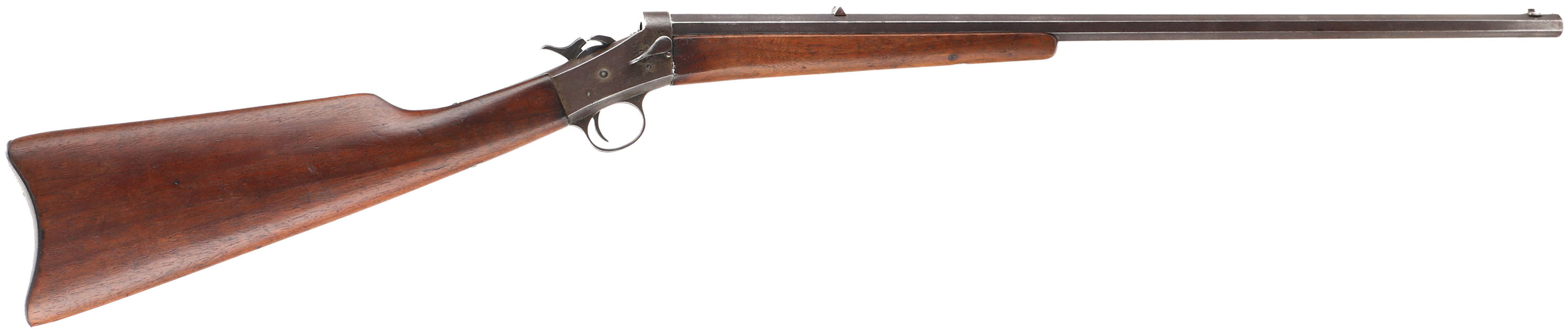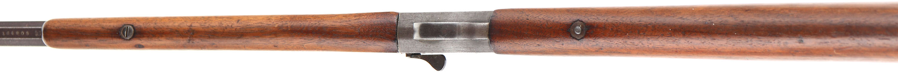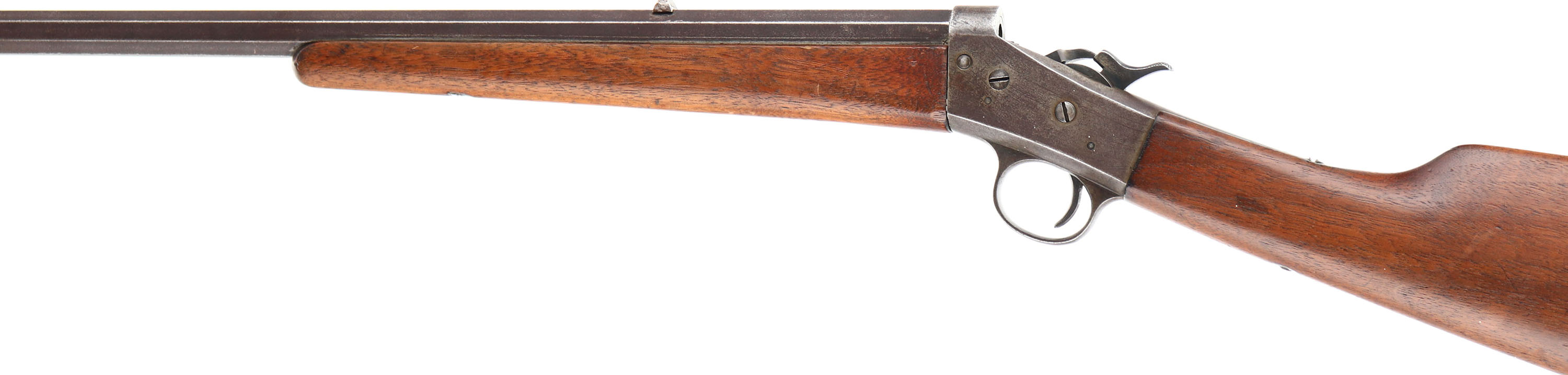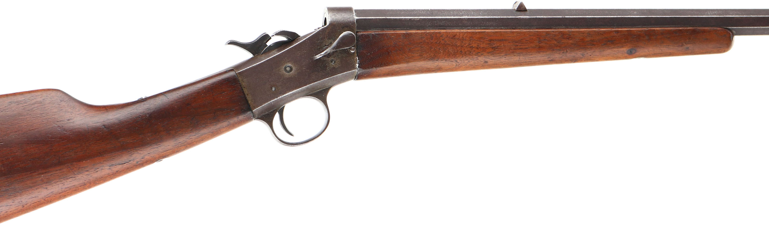 Remington, Model 4 Take-down, .32 SHORT or LONG R.F., MFG 1902-24, SN: 164908, Rolling block single shot rifle. 24'' Octagon barrel. The model 4 was produced from 1890 to 1933 in several variation & evolutions. The model 4 began production in 1890 as a screw in fixed barrel, but it was change to a takedown with lever in 1902 until 24 when it was changed again to a take-down screw. The rifle with the take-down screw was produced from 1924 to 33. The straight grip wood stocks are very good & solid. They carry the original finish with the usual small dings & scratches. There is a 1/2'' by 1 1/2'' missing chip to the left side of the toe. The original metal blue finish has fully toned to an even coverage of brown patina on both barrel & receiver. Bore is poor, with lots of pitting & scarring to the worn rifling. Barrel carries a fixed dovetail rear & standard front sights. The stock carries a smooth metal Remington buttplate. FFL or C&R Req. - Value: 150 to 300