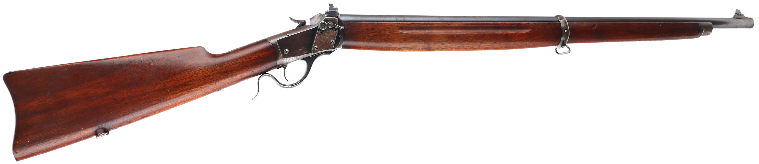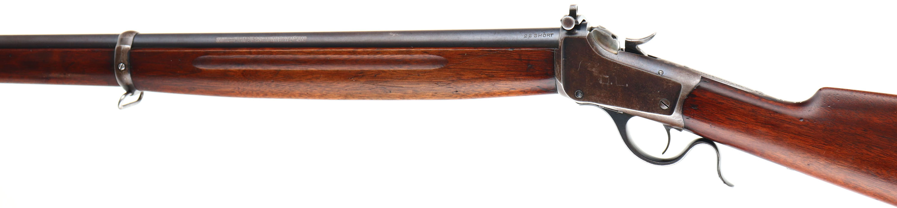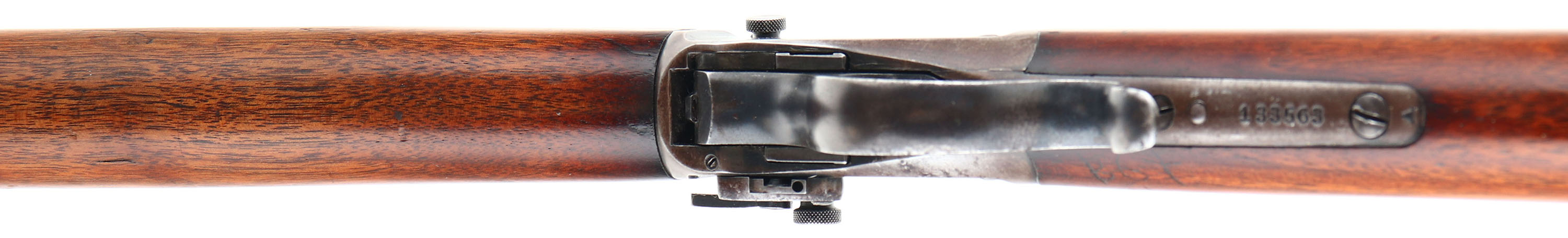 Winchester Model 87 Winder Musket, CAL: marked 22 SHORT, MFG: 1919, SN: 133563, Lever Action Falling Block Single Shot Rifle, 28'' Round barrel. This is the third variation of the Winder musket built on the low wall frames of the 1885 rifles. The third variation was introduced in January 1918 & ended just two years later in June of 1920 with total production estimated at 13,000. This example is ''U.S.'' & Firebomb stamped behind the hammer & ahead of the upper tang. The original single barrel banded stocks are very good & solid, with most of the original finish remaining. There are numerous minor surface scratches, small contusions & scrapes. There is also 3 initials lightly scratched into the stock just above the lower tang on the right side of the wrist. The metal blue finish has thinned on the barrel to about 50%. The receiver finish has worn to a thin brown patina, with remains of original blue in more protected areas. The initials ''O.L.'' are scratched into the left side of the receiver. Bore is good, with some roughness amongst thinning rifling. The receiver holds a Lyman No. 53 adjustable windage/elevation peep sight, while the barrel carries a small blade front sight. Buttstock carries a smooth metal carbine style buttplate. Factory sling swivels. A nice example. FFL or C&R Req - Value: 500 to 1000
