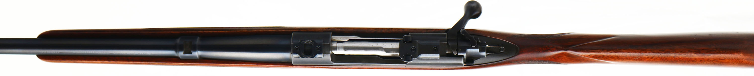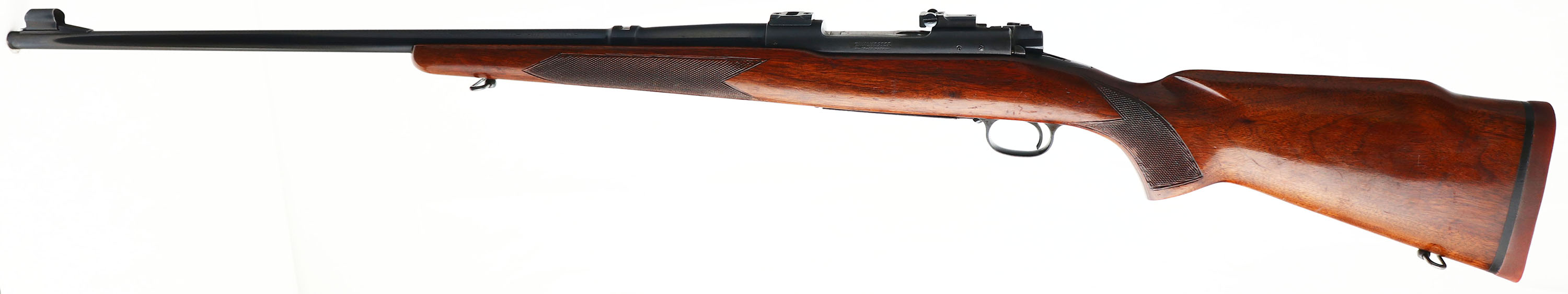 Winchester, Model 70, CAL: 338 WIN MAGNUM, MFG: 1961, SN: 520090, Bolt Action Rifle, 25'' barrel. Desired pre-64. The original, checkered & flat pistol grip Monte Carlo stock is very good. An attempt to retrace the checkering was done long ago & the stocks received an added thin layer of finish over the remaining original finish. There are numerous light handling marks, scratches & contusions, with some thinning & haze to the finish. The original metal blue finishes rate 95% overall. Bore is very good. The receiver carries scope blocks, while the barrel has an open rear dovetail & a hooded front ramp sight. Stock carries a Winchester solid recoil pad. Factory sling loop. The 338 Win Mag caliber is one of the more desirable calibers amongst collectors & premiums are typically paid for examples which still present well like this example. FFL or C&R Req. - Value: 1000 to 2000